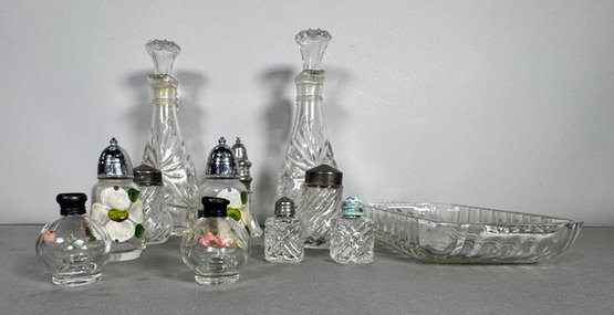 Collection of assorted cut glass vessels, including two decanters, salt and pepper shakers, and a small serving dish. Tallest decanter measures approximately 8 inches.