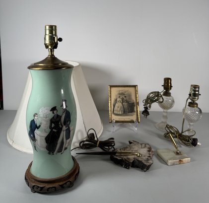 Collection of lighting and decorative items. Includes a table lamp with a painted base and damaged shade, two glass and metal sconces, a framed print, and more. Tallest item: 18.25 inches.