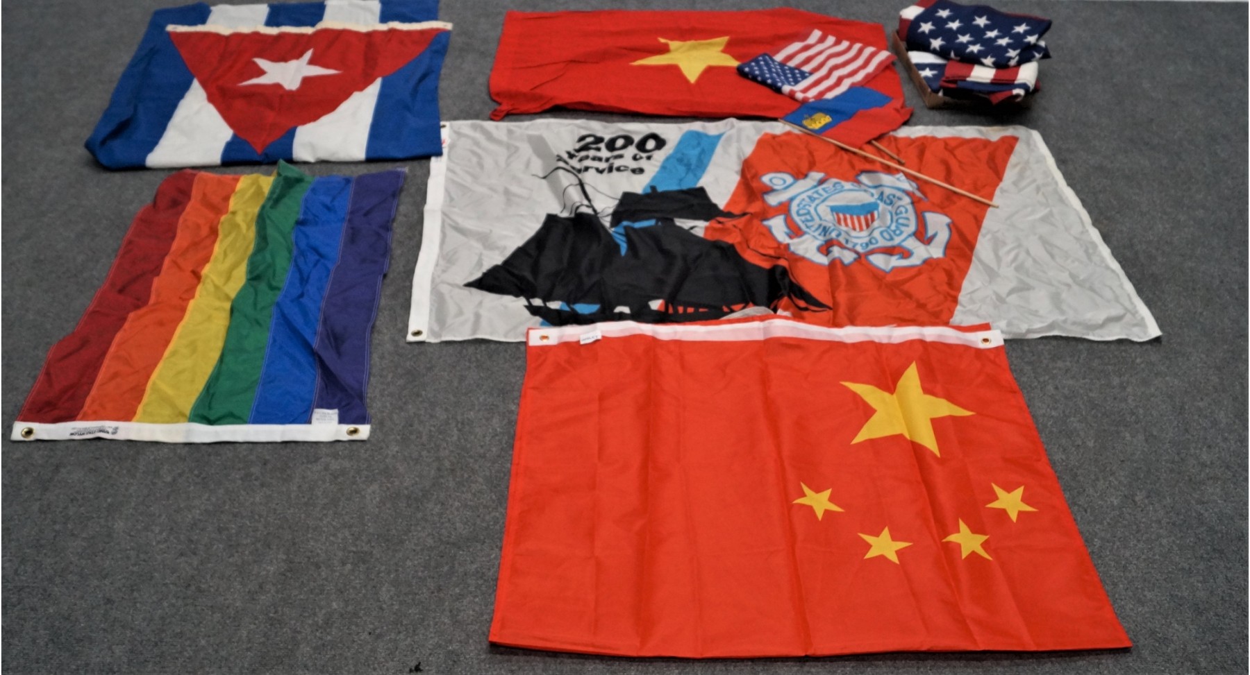 Listed are 3 full size flags (including 3 American) and two small hand held ones. See photos for details.