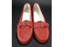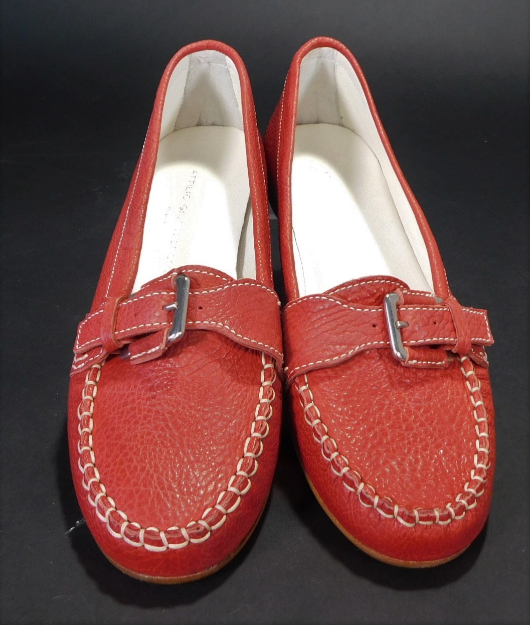Brand new in box. Flat, slip on, with buckle in front. Size 8 USA. Size 38 Euro. Red color.
