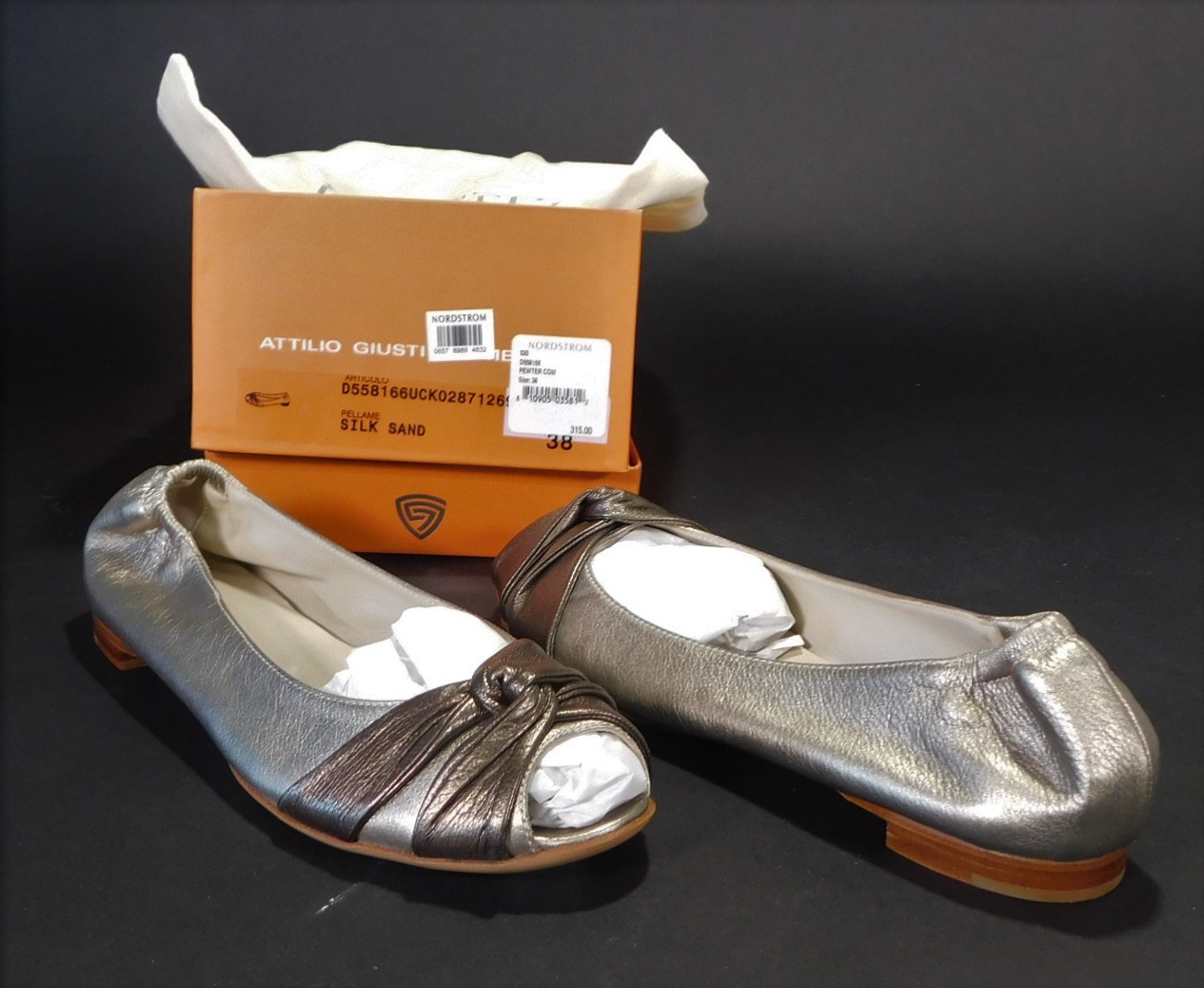 Brand new in box. Silk Sand color. Size 8. Two tone peep toe flat. Elastic back for easy slip on. Made in Italy. European size 38.