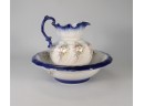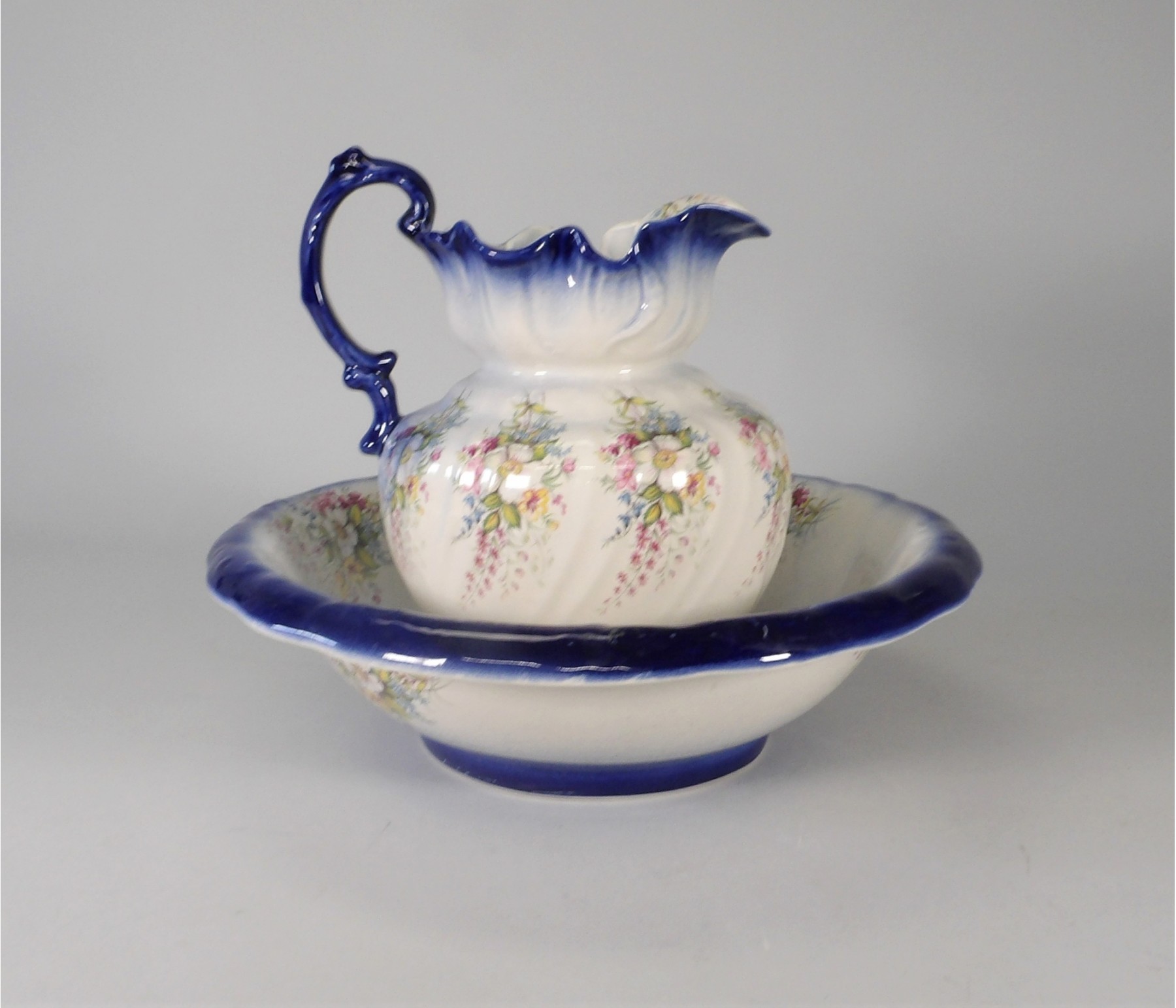 Listed is a lovely water basin 15.5"dia. x 4"h and matching floral pitcher 11"h x 5"dia. They were made in England - most likely Staffordshire pottery. There is a very small area of crazing on the pitcher, but these 2 pieces are in very good condition. See photos for details.