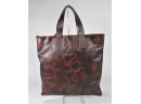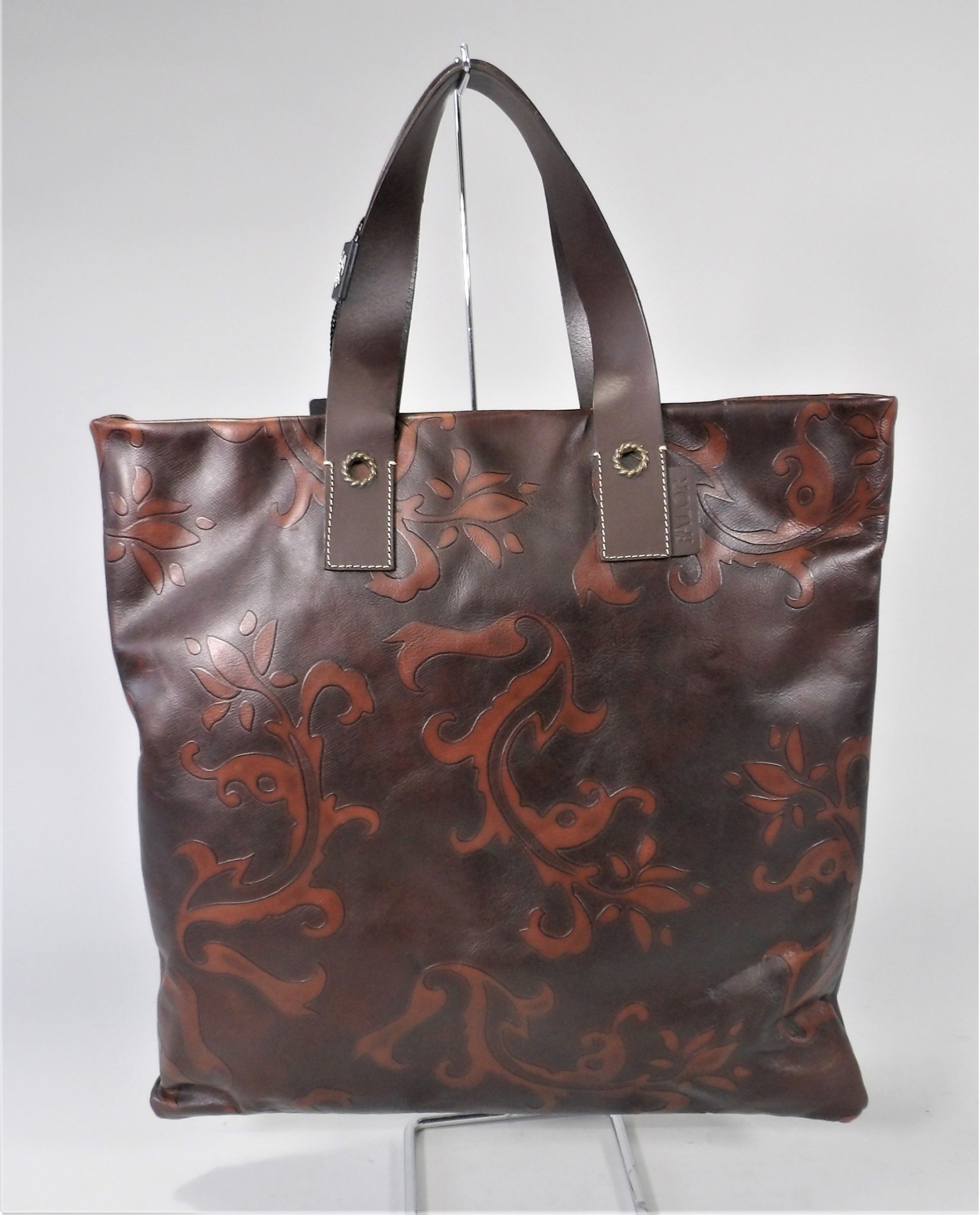 Listed is a beautiful Italian leather shoulder tote bag - 16" x 16". It is two-toned brown, tooled with embossed scroll design. There is an interior zippered compartment and the lining is brown velour. This bag is in very good condition with tag still attached. See photos for details.