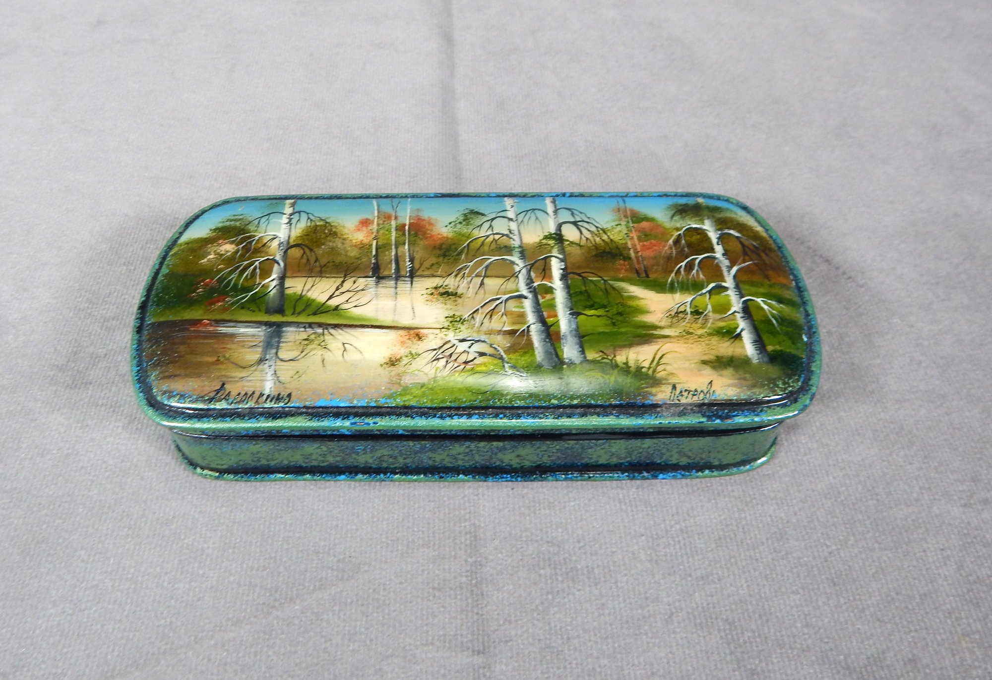 Lovely lacquered box with bright red interior. Measures 5.75" x 2.5". Very good condition.