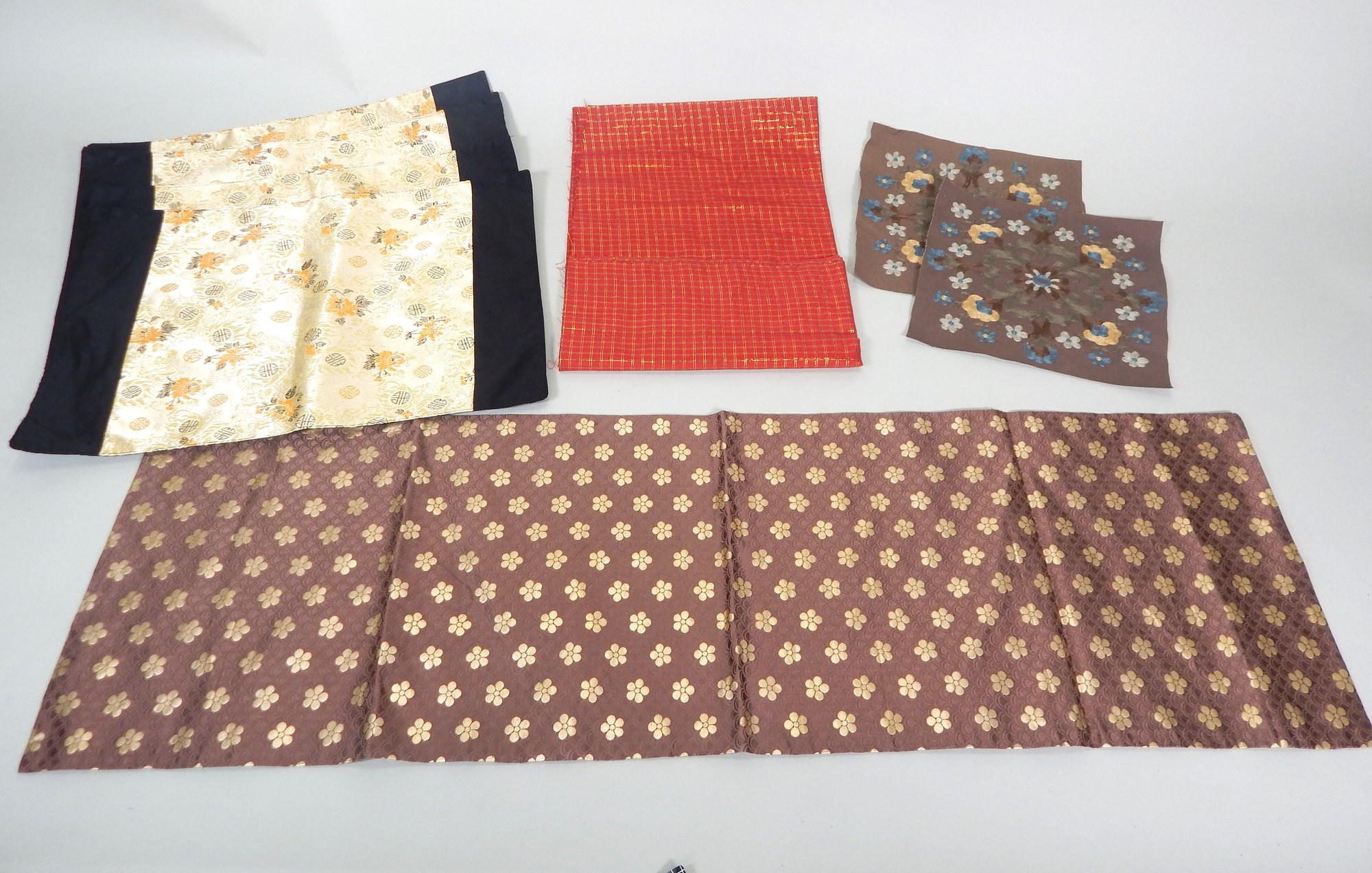 4 Asian silk placemats measuring 19" x 13"; 2 10"square embroidered floral matts; 1 silk gold & brown runner - 41" x 12" & red cotton & gold fabric 47" x 44". Condition of all items is very good.