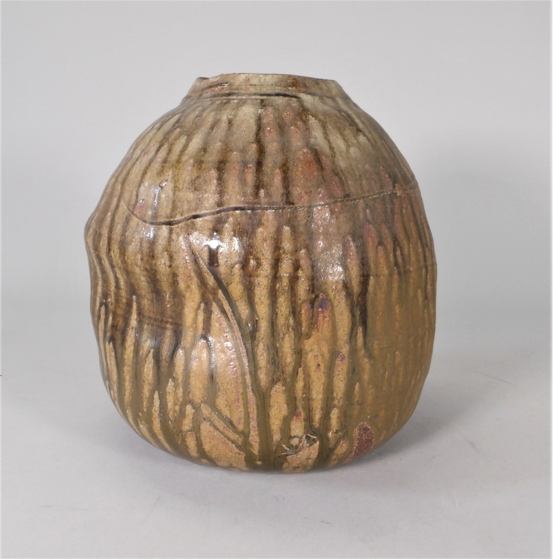 Listed is a heavy earthenware pot of irregular shape and nice glaze. It measures 11" in height and 4" at the opening. The curves flows nicely and the glaze follows a drip pattern. What looks to be a chip on the top rim seems to be glazed over. Overall condition is very good see photos for details.