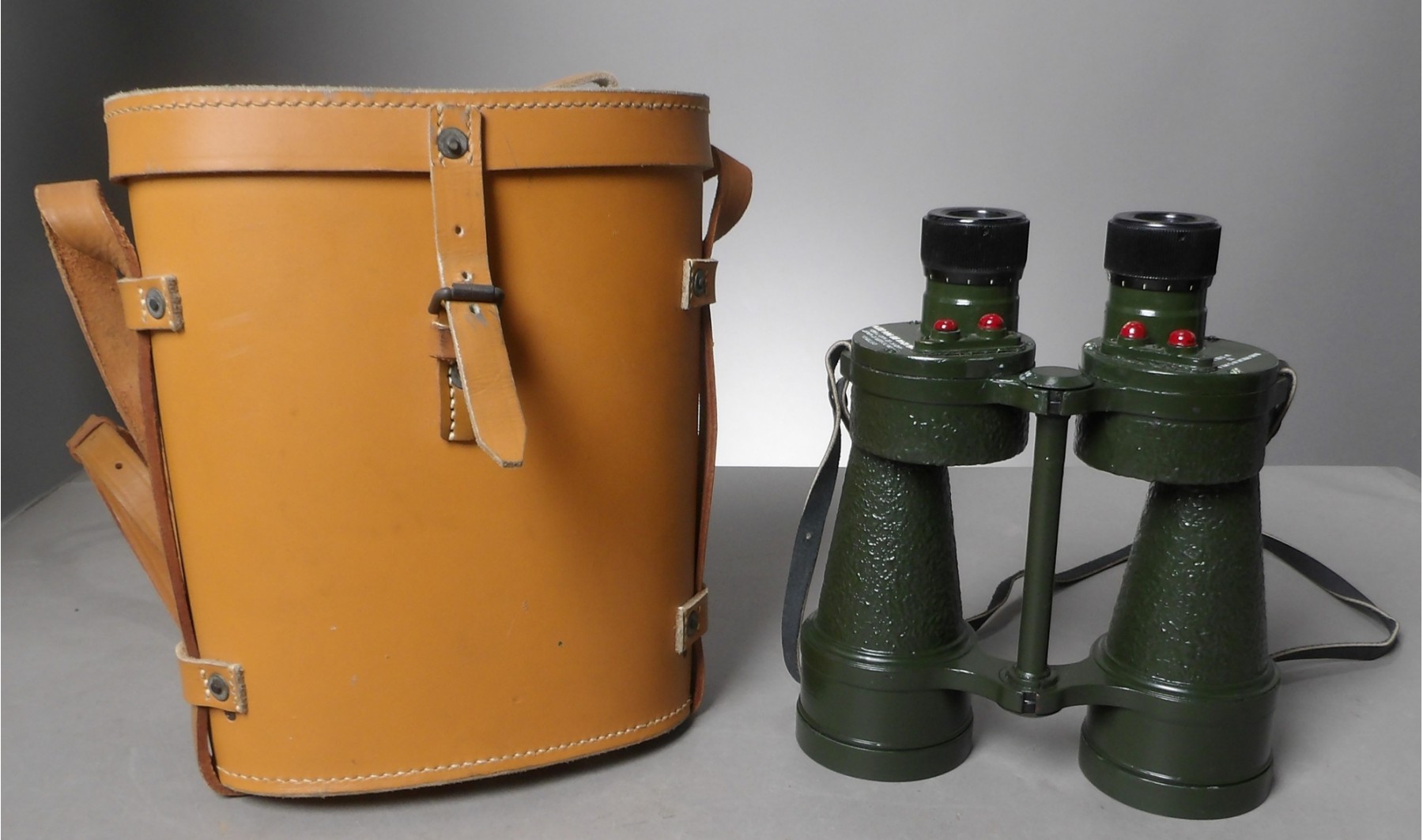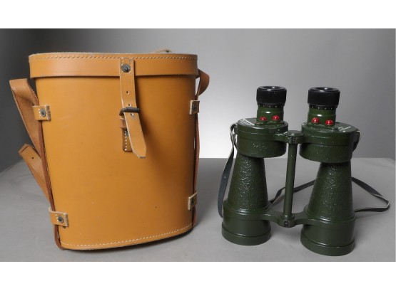 This pair of binoculars dates back to 1941. Made for British forces during WWII. MK 4. 7 x 50 magnification. Serial No. 51875. Green crackle finish body. Comes with a leather case with straps.