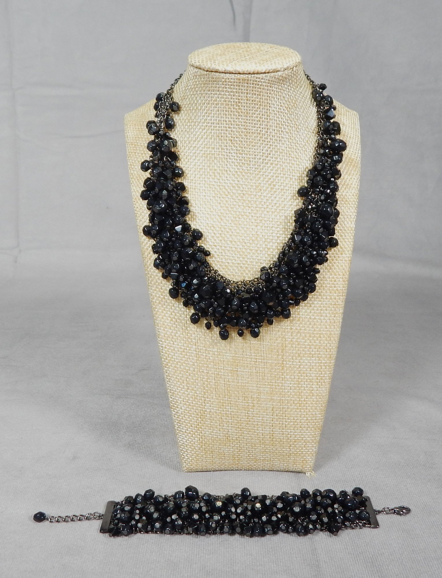 Multi-faceted beads decorate this choker necklace and bracelet. Metal is charcoal colored. Necklace is 16" total length. Bracelet is 6 1/2" and extends to 7 1/2". Great condition. Shipping is available.