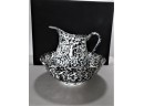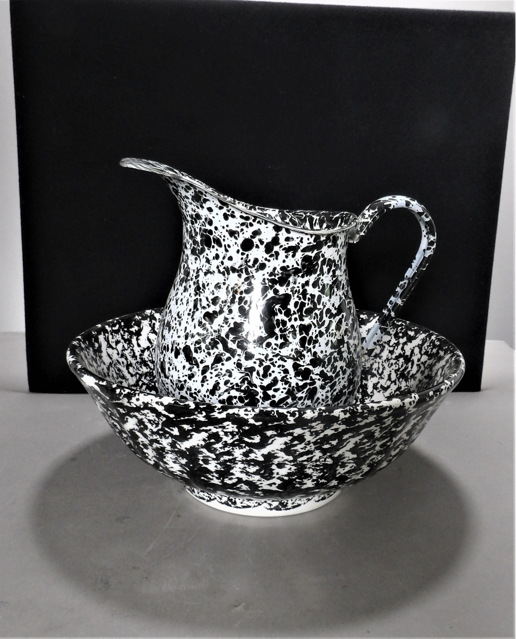Listed is a metal enamel spatterware pitcher 9"h x 9.5"w. Also listed is a ceramic splatterware bowl 12" diameter x 4.5"h, made in Italy. These items are in very good used condition. See photos for details.