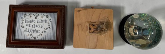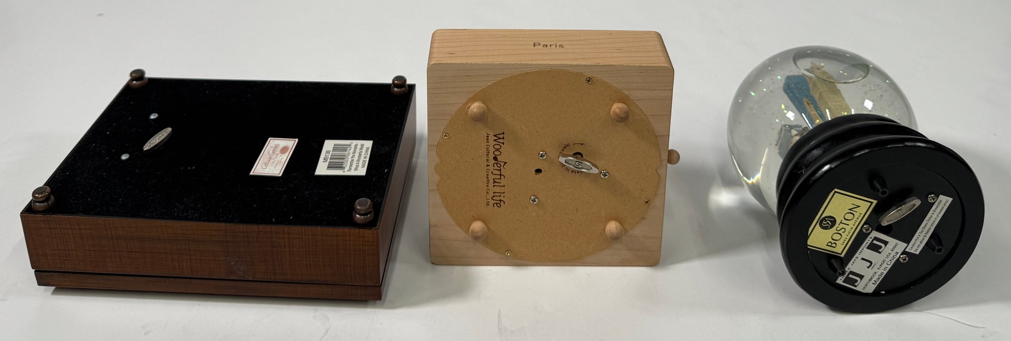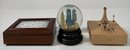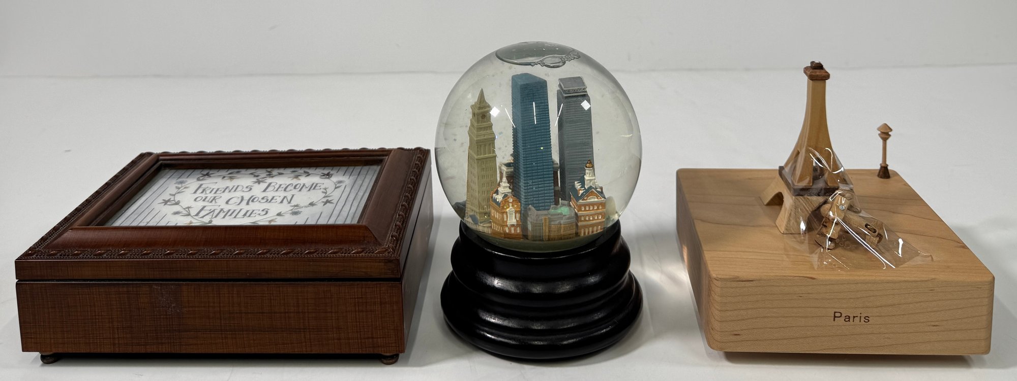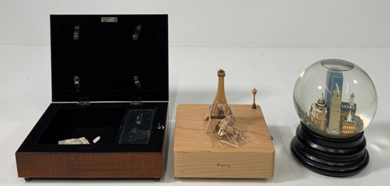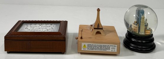 A collection of three decorative items including a wooden box, a snow globe featuring a city skyline, and a wooden Eiffel Tower. Largest item (wooden box): 3'' x 8''.
