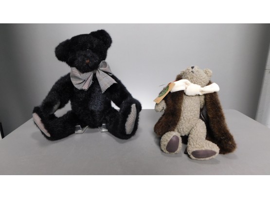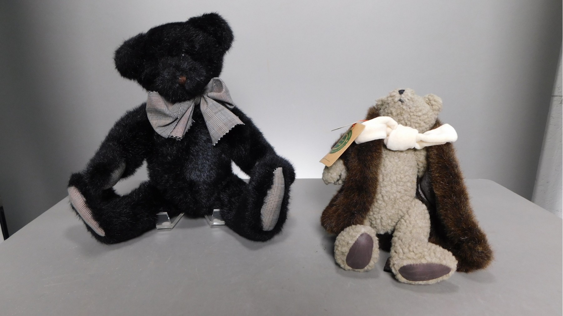 The tall, black bear is 14 inches tall. His arms and legs joints move. His bowtie matches his paw pads. The smaller bear is 10 inches. Fashionably dressed in a faux fur coat. His arms, and leg joints move, also. The coat is removable.