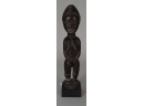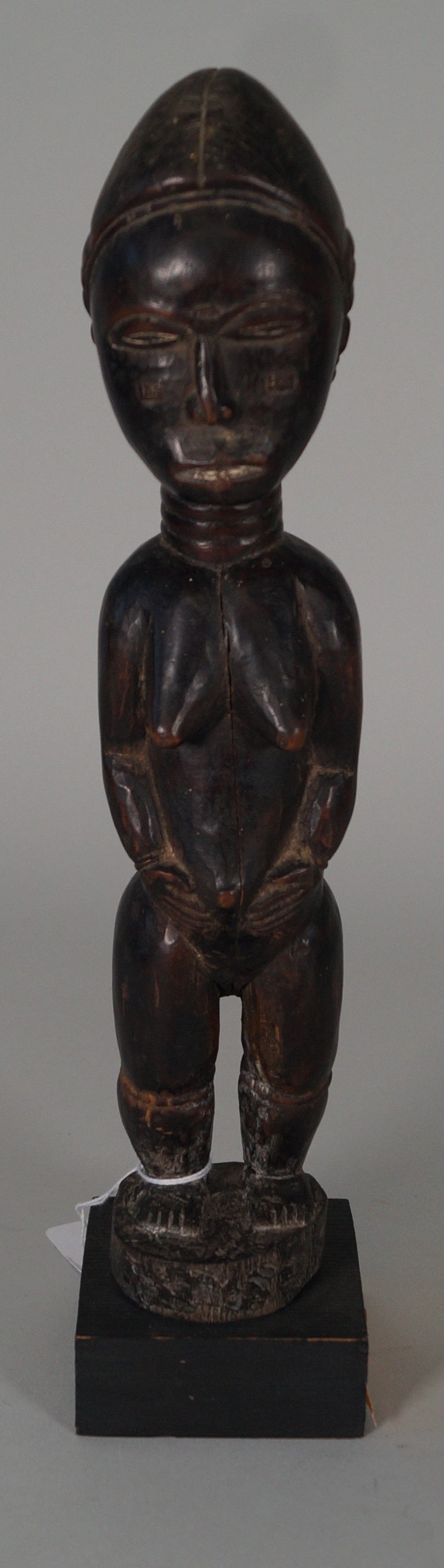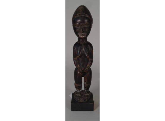This appears to be a pregnant woman holding her stomach. There is a crack in the wood right down the middle of her breasts.