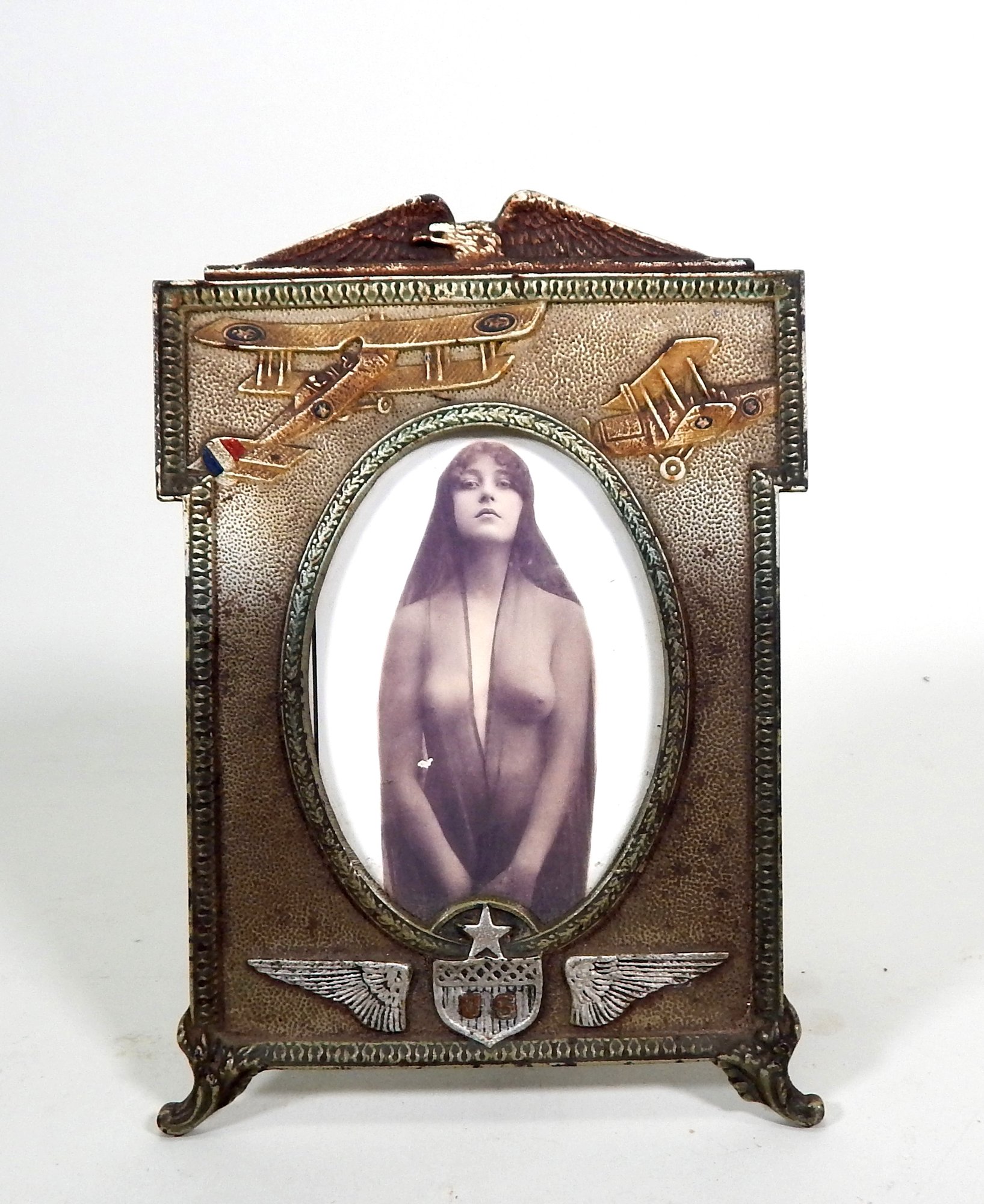 Cool WWI Era cast iron picture fame wit eagle and planes with semi -nude photograph.