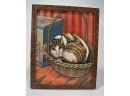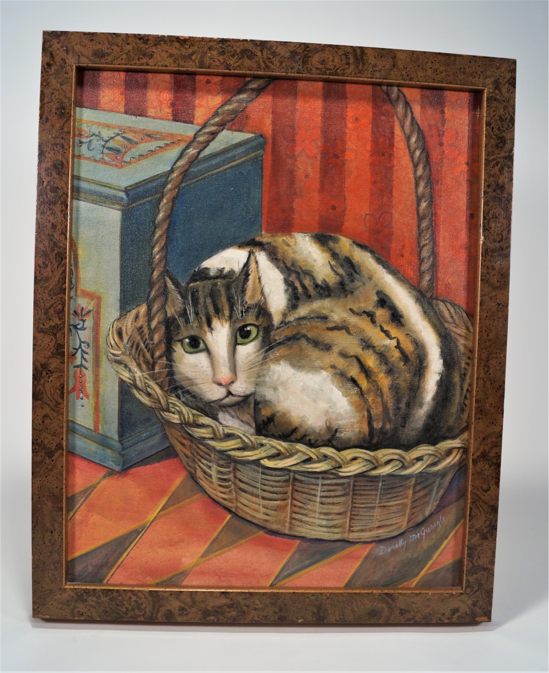 Listed is an oil painting entitled Cat In Basket by Rhode Island artist Dorothy McGunigle (1914-2005). The painting measures 22"x18" and signed by the artist in the lower right. Mrs. McGunigle was a 1935 graduate of Rhode Island School of Design. She was a professional interior designer and decorator. She was an active member of the Providence Art Club and exhibited at numerous shows . The Rhode Island Historical Society's permanent collection contains one of her oil paintings as an outstanding example of 20th century artwork by a woman artist.