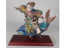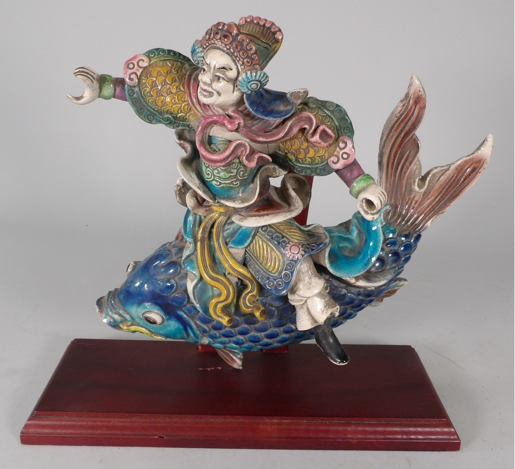 When on the stand, this warrior stands 12 1/2" tall. Brightly colored with a fierce face, he is riding a giant blue fish. Some crazing, and a large chip in the back, as shown.