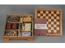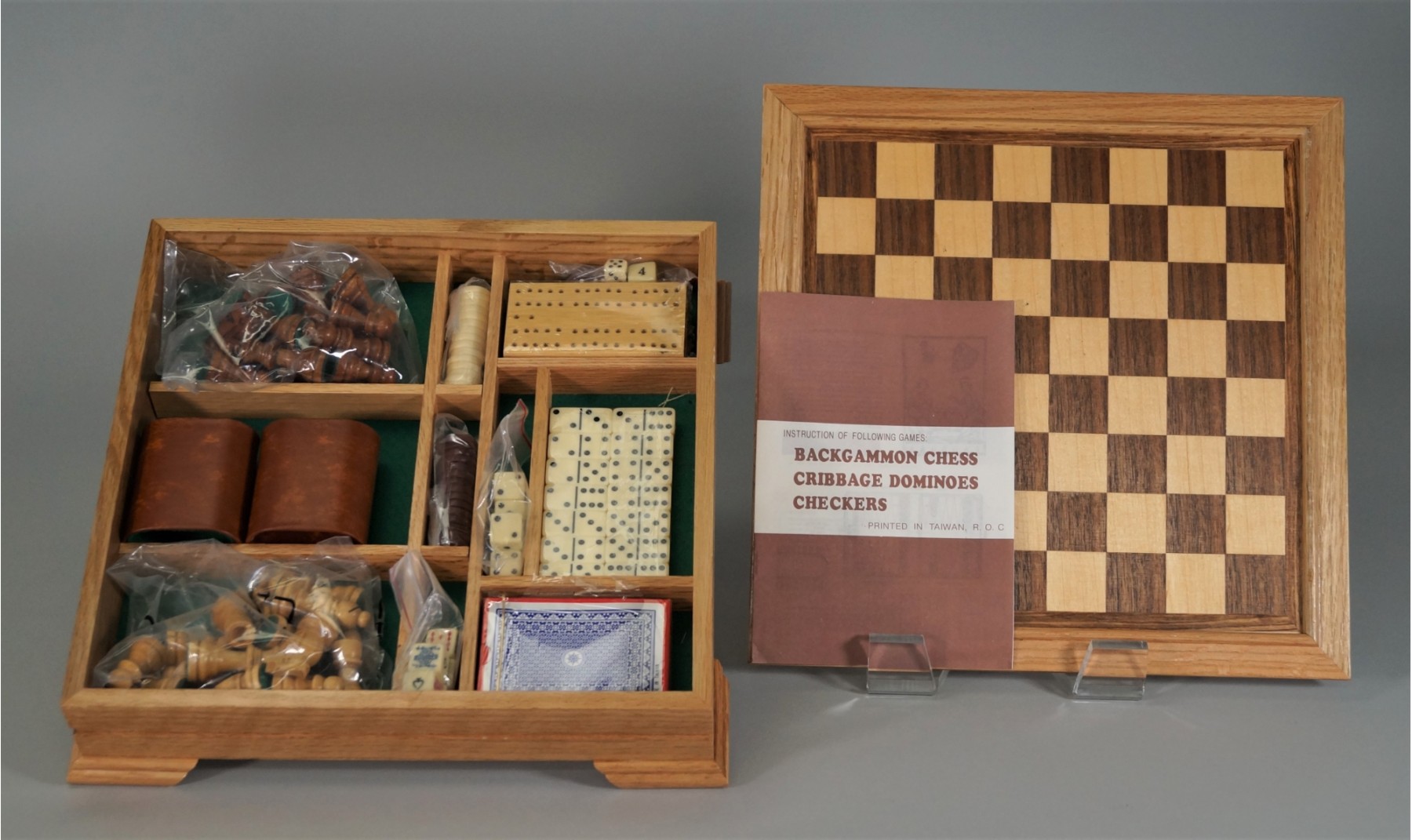 Listed is a brand new, never used wood set of games that includes chess, checkers, dominoes, backgammon, cribbage, poker dice, regular dice and playing cards. Wood top chess board flips to become backgammon board. Includes an instruction booklet. Measures 12" square. In wonderful condition - waiting to be played!