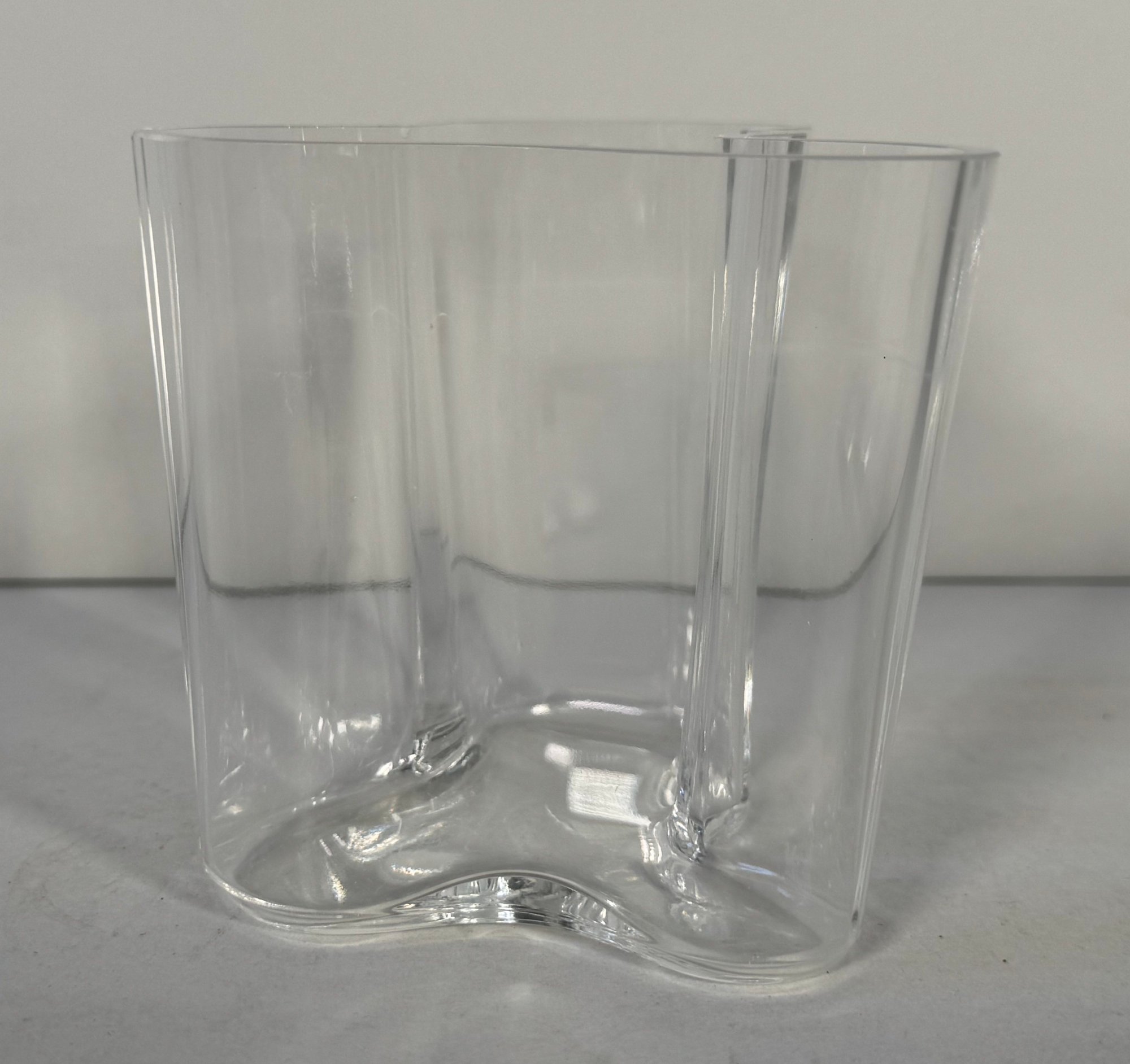 A freeform clear glass vase with a wavy rim.