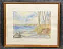 Original watercolor painting on paper, depicting a tranquil coastal scene with trees and a shoreline. Signed and dated by the artist, unknown. Housed in a simple wooden frame. Additional info including date en verso.