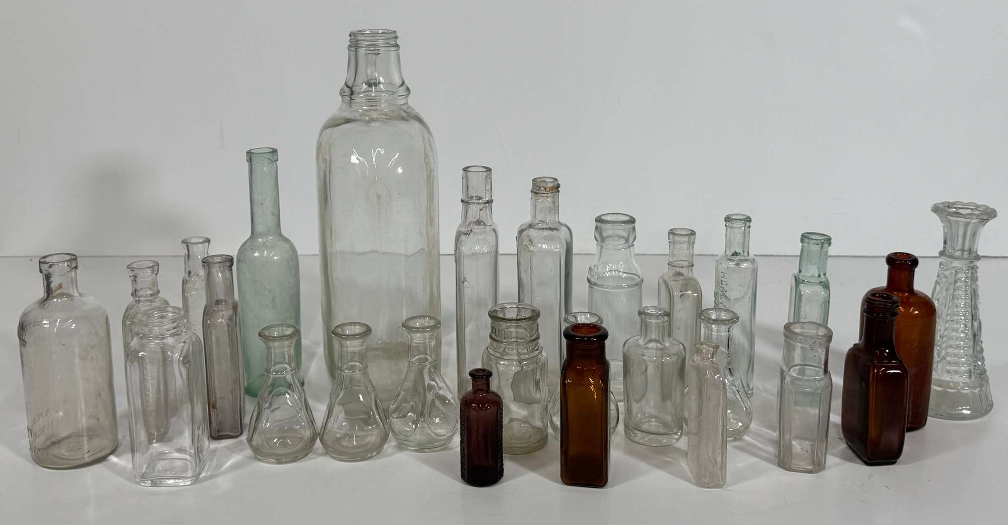 Collection of antique and vintage glass bottles. Includes clear and amber glass in various shapes and sizes. Tallest bottle measures approximately 12 inches, smallest approximately 3 inches.