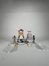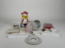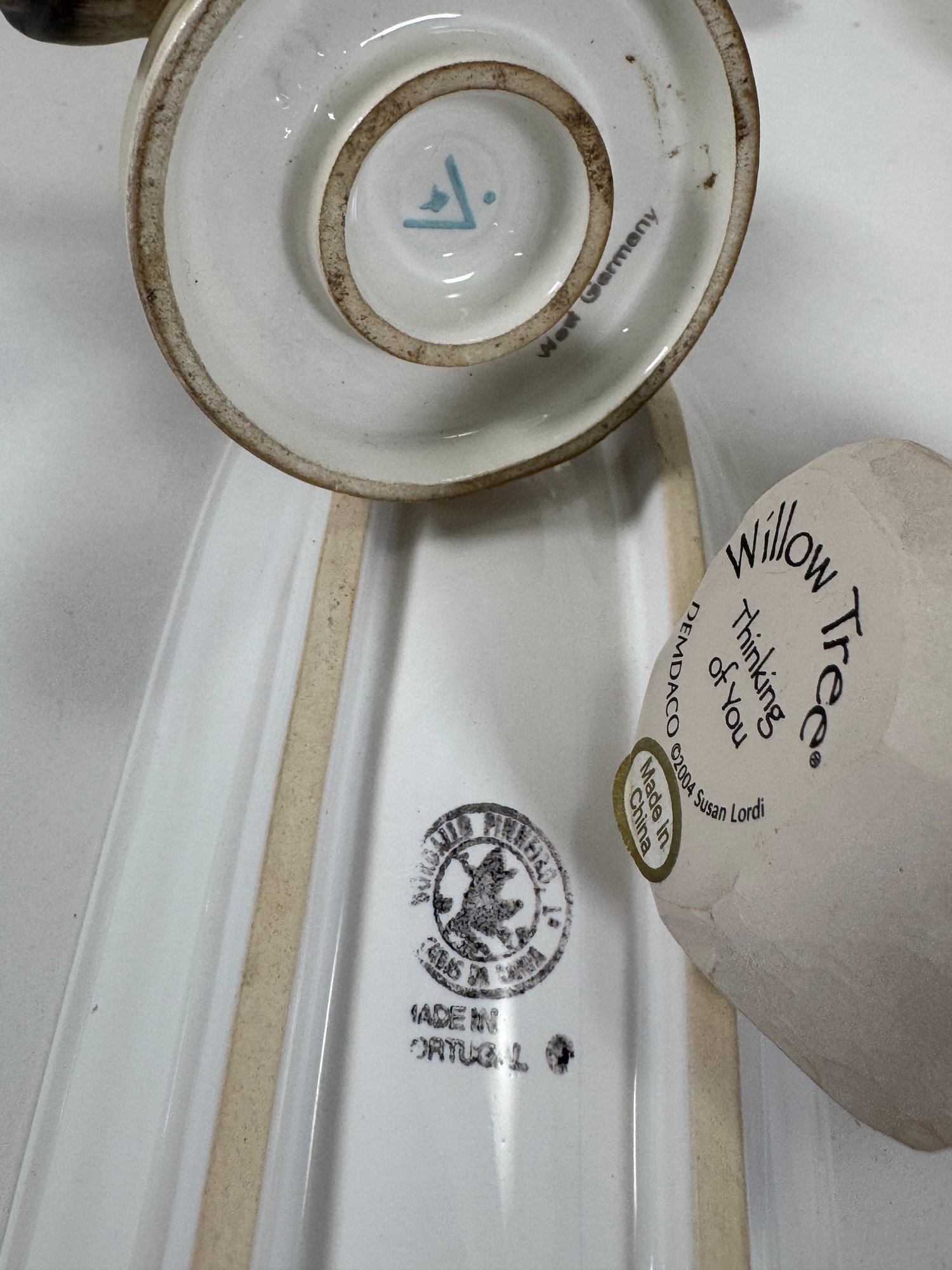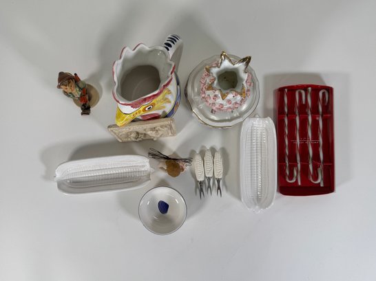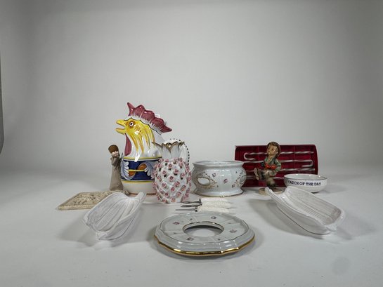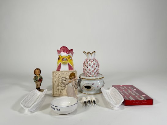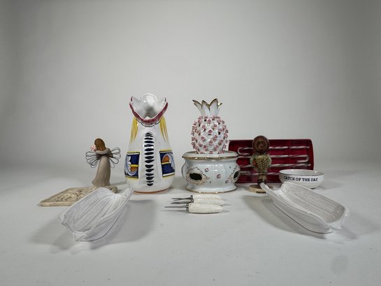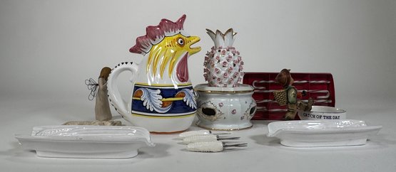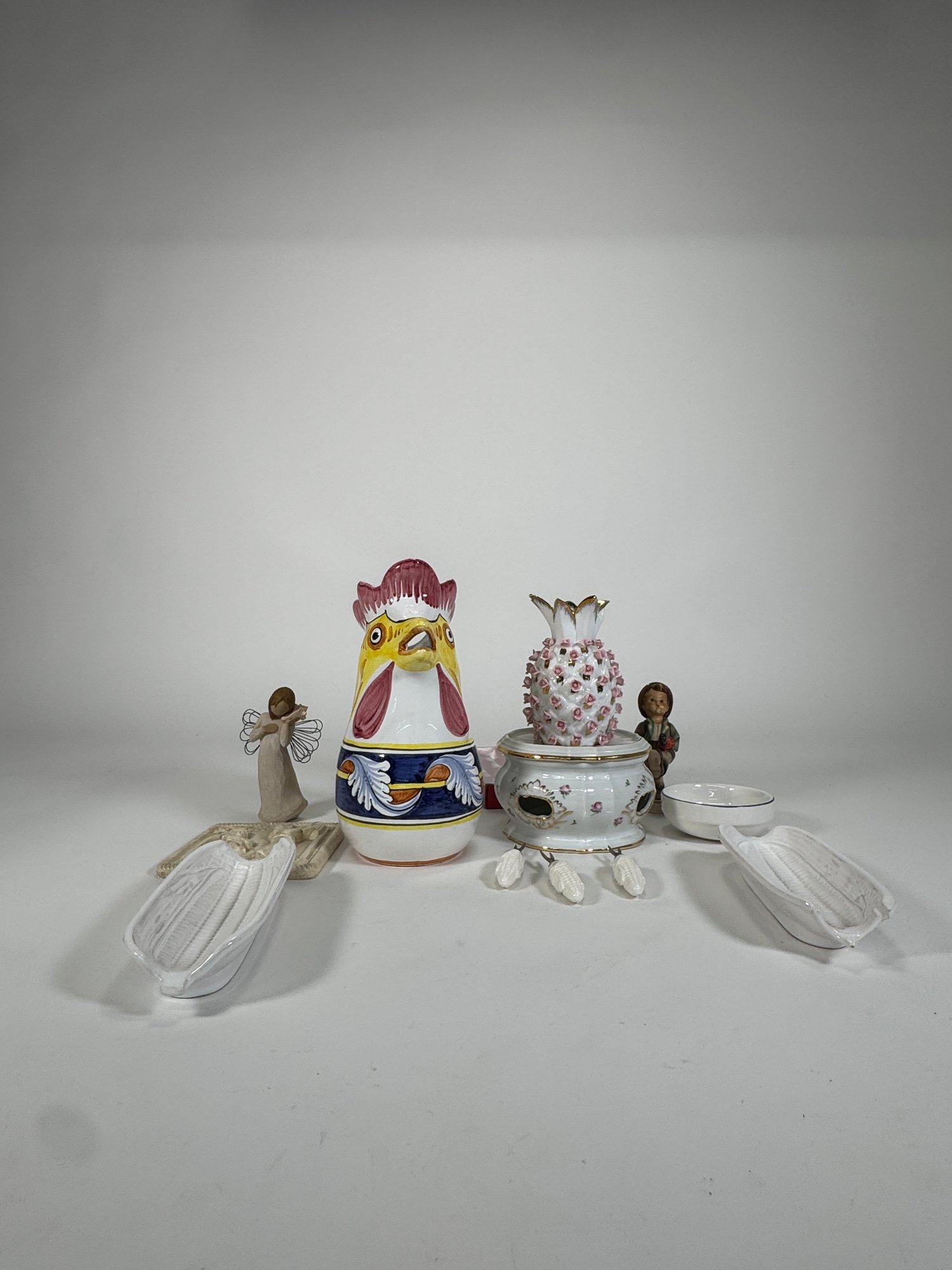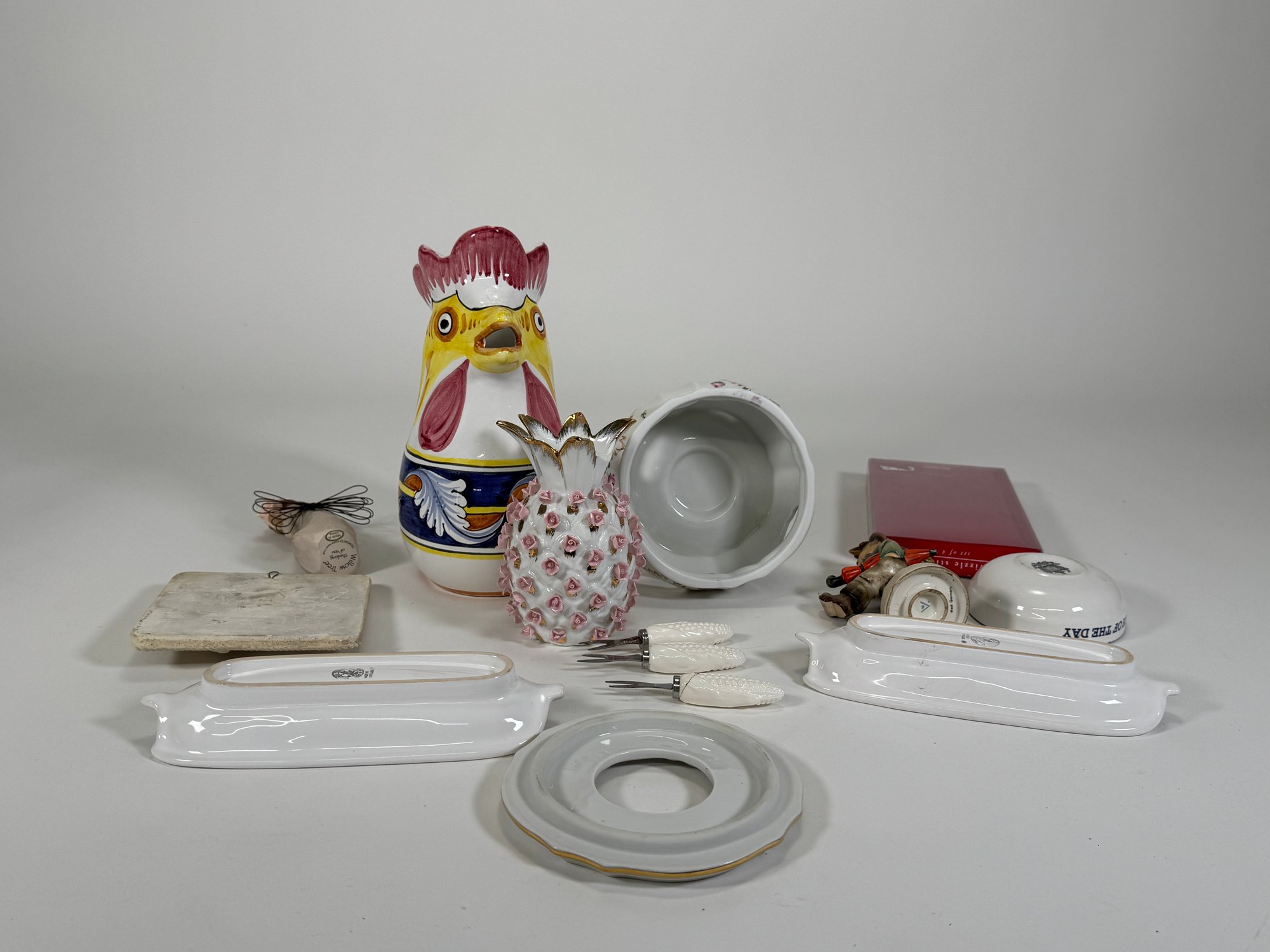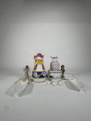 Collection of decorative ceramic items, including a rooster-shaped pitcher, a pineapple-shaped vase, small figurines, and serving dishes. The rooster pitcher is the largest piece, approximately 9.5 inches tall. The lot weighs approximately 115 ounces. Some minor wear is present.