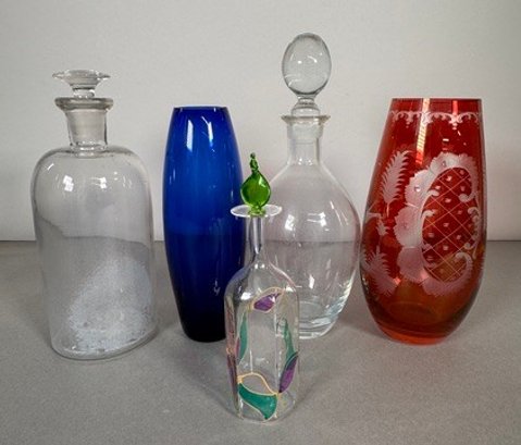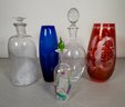 Collection of five decorative glass vases and decanters. Includes clear glass decanters with stoppers, a red etched glass vase, a blue glass vase, and a small decorative glass decanter with green stopper. Tallest item measures approximately 7.5 inches.