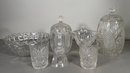 Collection of seven pieces of cut glass, including two covered jars, a bowl, a compote, and two tumblers. Tallest item approximately 8.5 inches. Includes Golden Crown E & R France sticker.