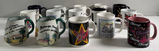 Collection of souvenir mugs, various sizes and designs. Includes mugs from Chicago, Vermont, and other locations. Tallest mug measures approximately 4 inches.