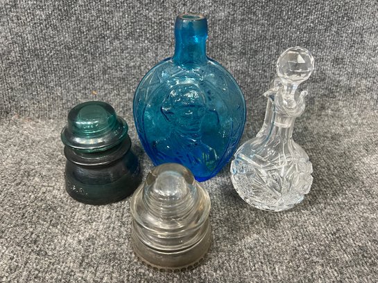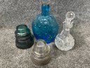 Collection of vintage glass items including a blue glass bottle with embossed design, a cut glass decanter with stopper, and two glass insulators. The tallest item measures approximately 8.25 inches.