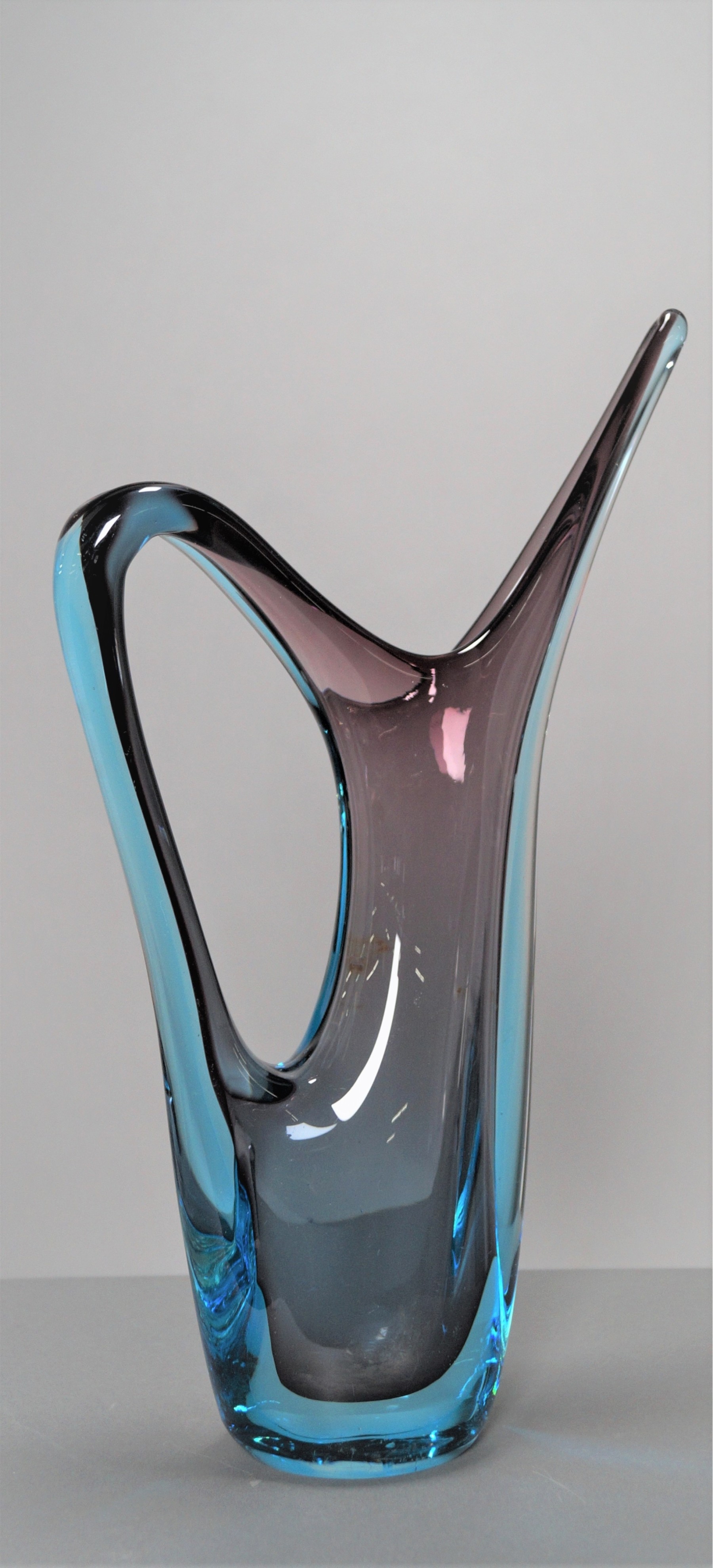 Beautiful blue and purple glass handled vase. In used condition.