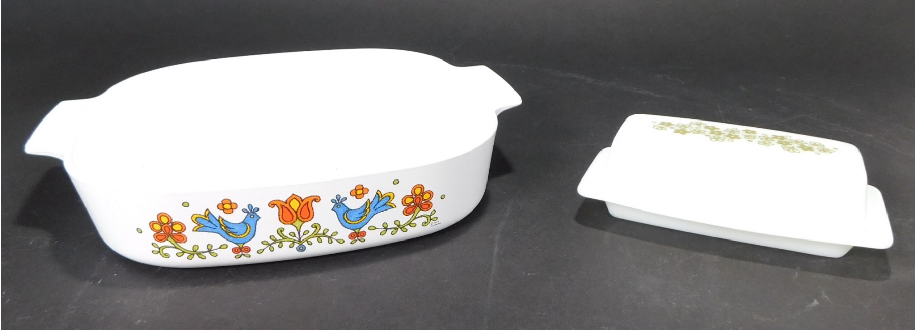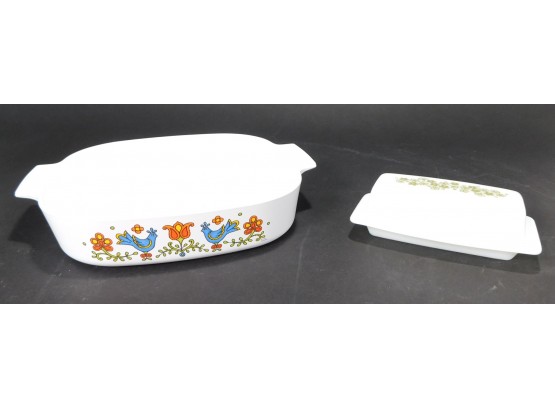 Baking dish is 9 3/4 x 9 3/4 x 2. Country Festival Bluebird pattern. Pyrex butter dish is Crazy Daisy pattern.