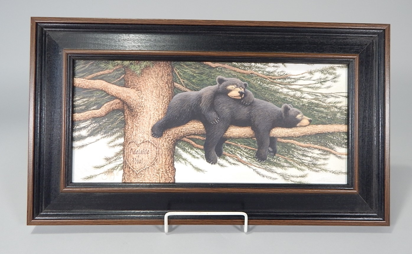 This print shows 2 American black bear cubs snuggling on a tree branch. It has been personalized, but you can pretend the names in the heart belong to the bears. The measurements below include the frame.