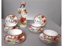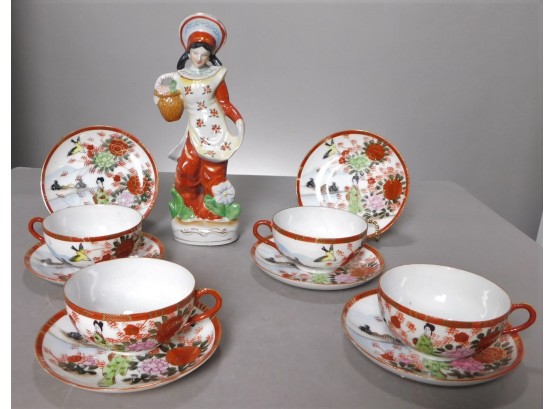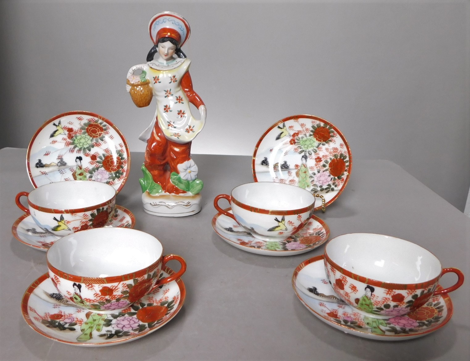 Dainty cups, and saucers. Lovely lady figurine with her basket.