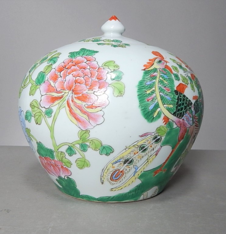 Listed is a lovely Asian jar with lid featuring hand painted floral decoration. It measures approx. 8" across at the widest part x 7.5"h. In very good condition with no chips or cracks. See photos for details.
