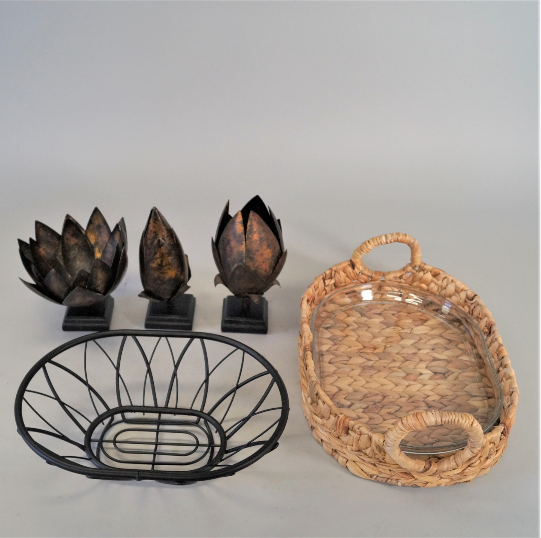Three decorative flowers, Iron basket and glass baking dish with removable woven pan carrier .