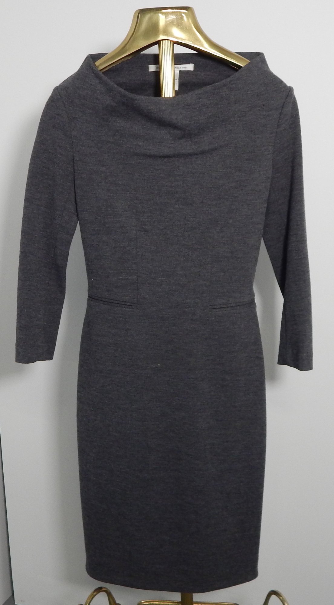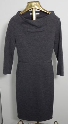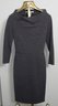 Wool blend charcoal gray dress has a side zipper, boat neck, knee length, 3/4 sleeves, and is dry clean only. It is size 2. Armpit to armpit is 16". Armpit to cuff is 13 1/2". Great condition. No rips or stains.