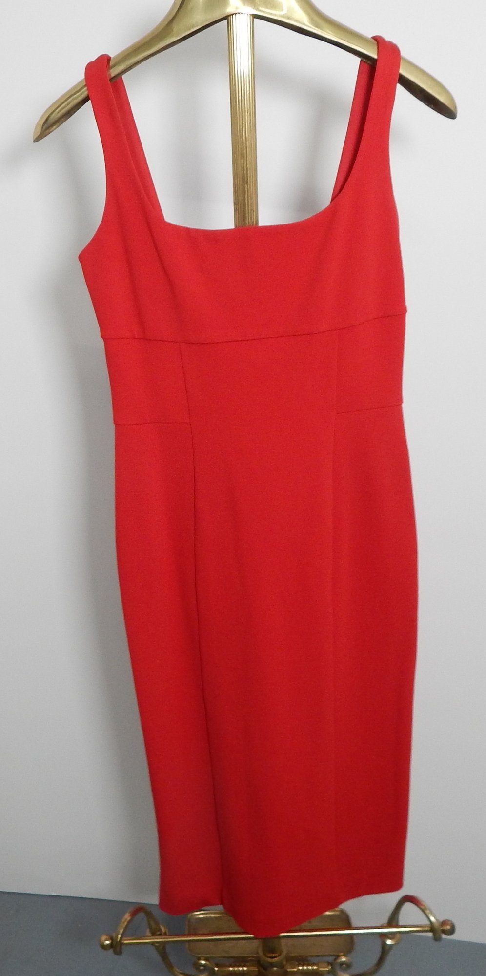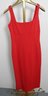 Here we have a pretty red dress made by Diane von Furstenberg. Style name is Bridget. It is a sleeveless knee length dress with a square neckline. Dress is made of 71% viscose, 23% polyamide, and 6% elastane for a bit of stretch. It measures 13" across the seam under the bust. From that same seam, dress measures 28 1/2" to the bottom. It is size 4. Dry clean only. There is a small tear in thread on the right front side, as shown. Shipping is available.