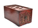 Antique Chinese wood box with hand carved details on top and doors.