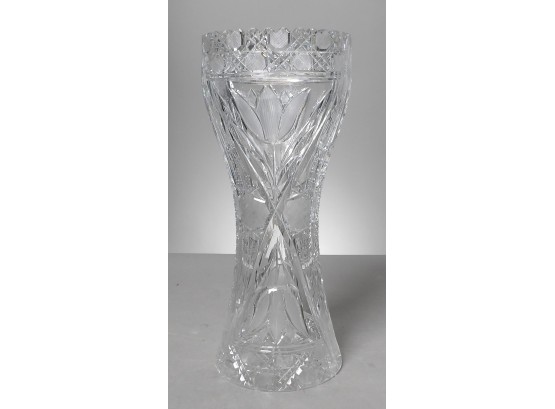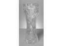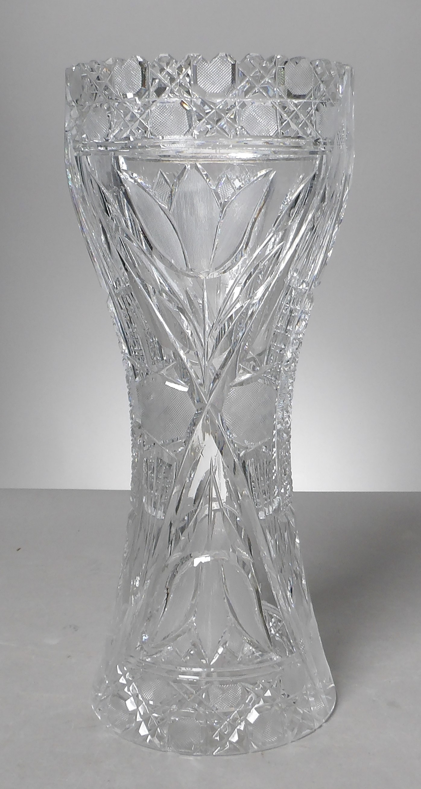 Beautiful cut glass vase with a tulip design. There are 2 places on the bottom that are chipped. I have photographed as best as I can. There is also a small chip on the top rim.