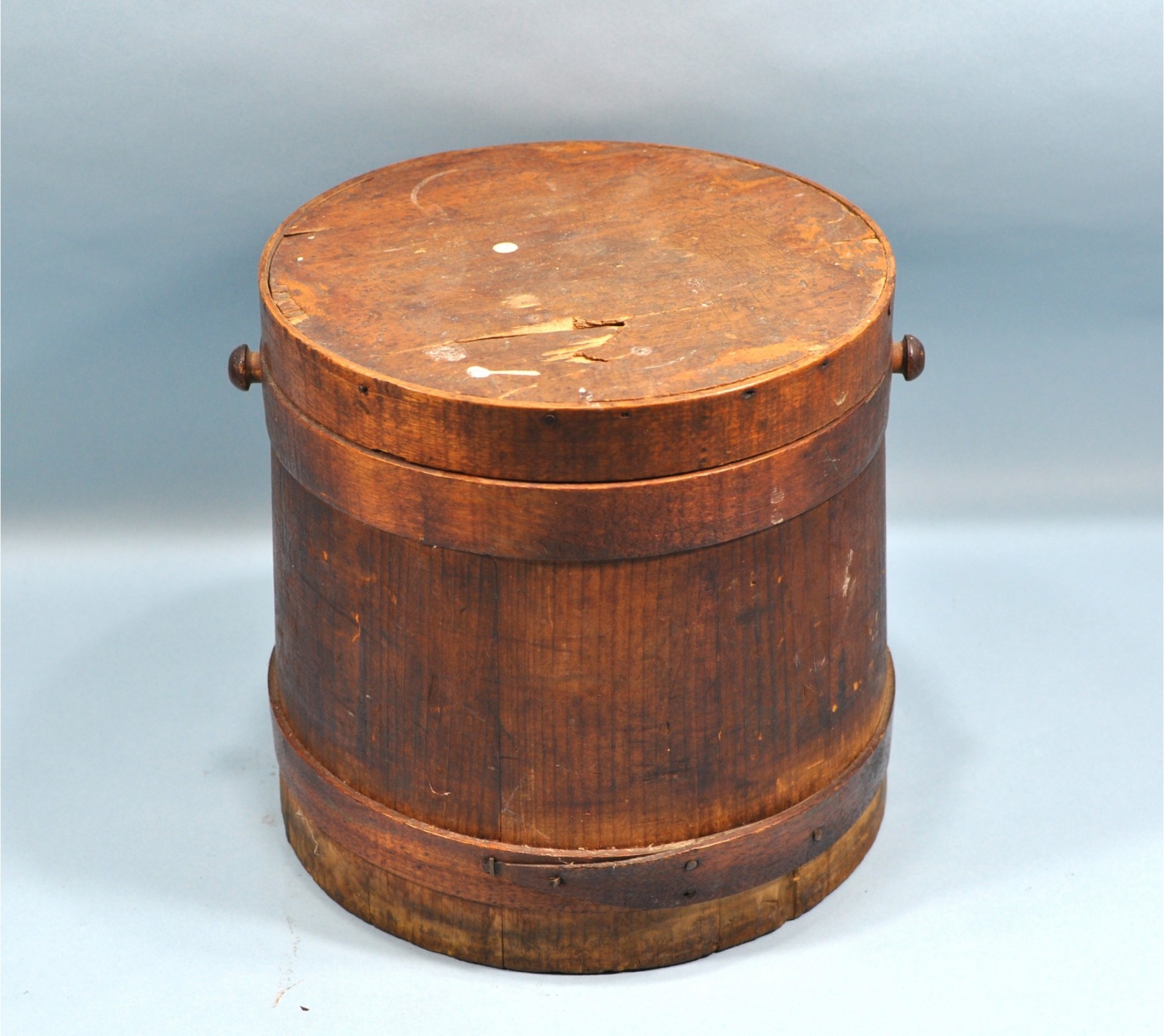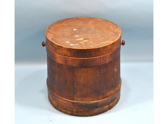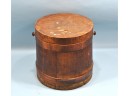 Antique firkin bucket, missing a handle, damaged lid on top.