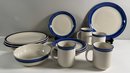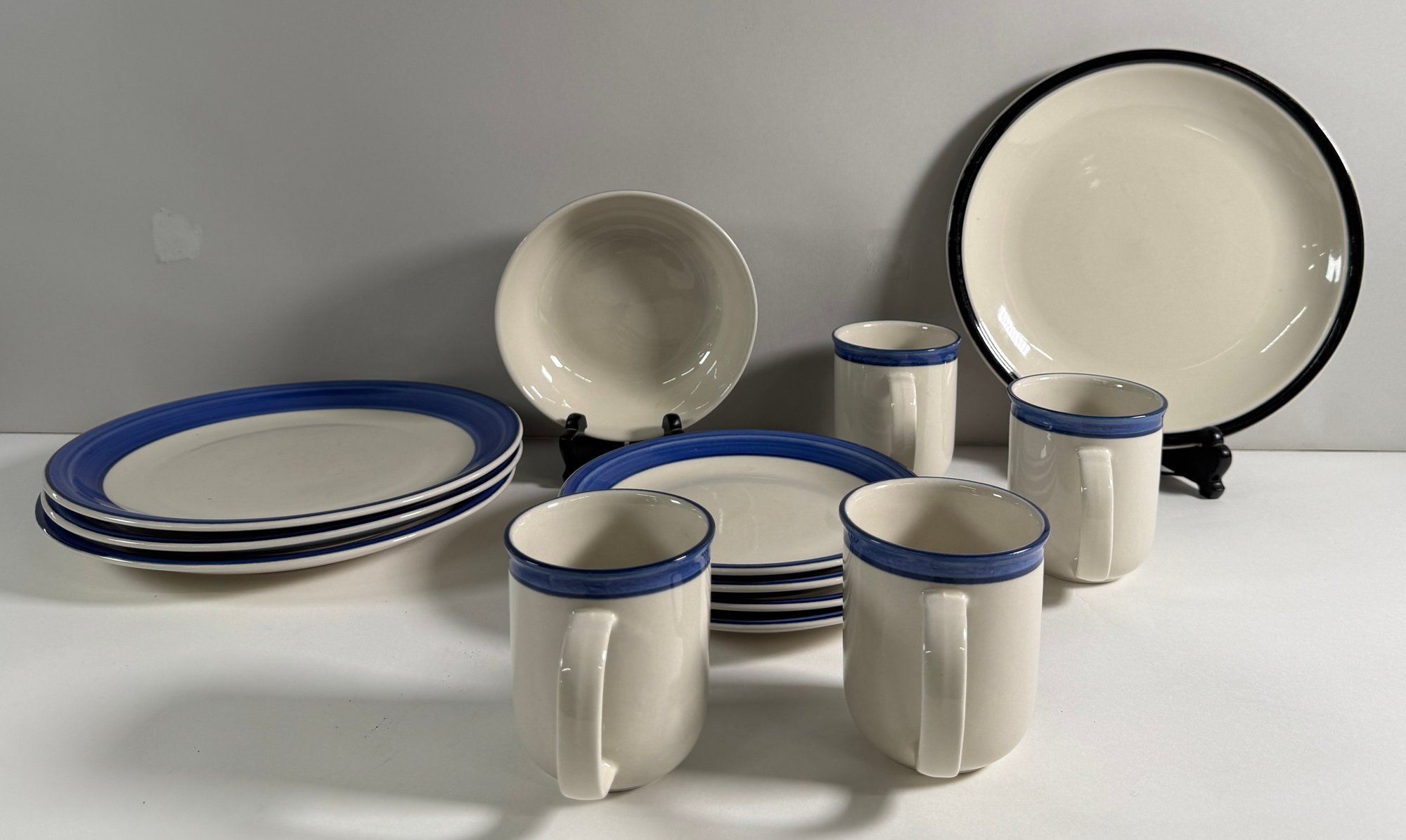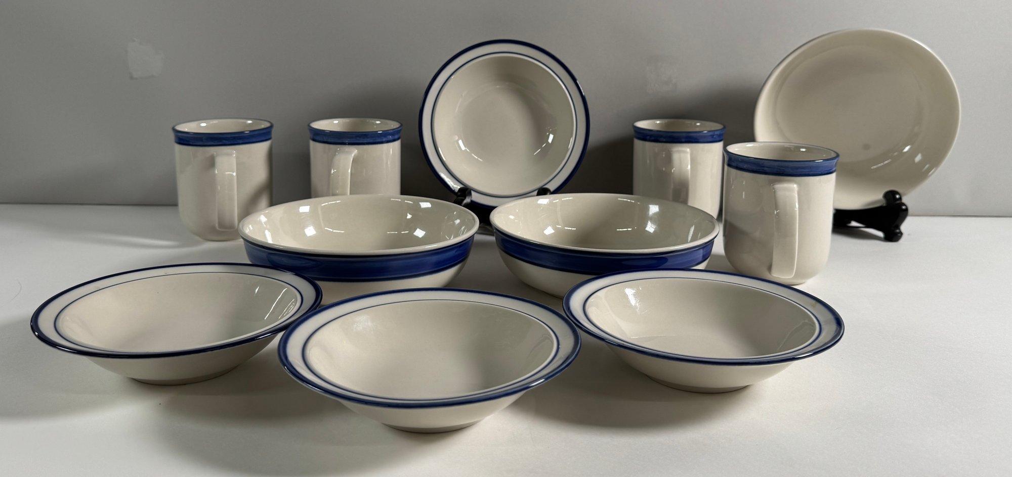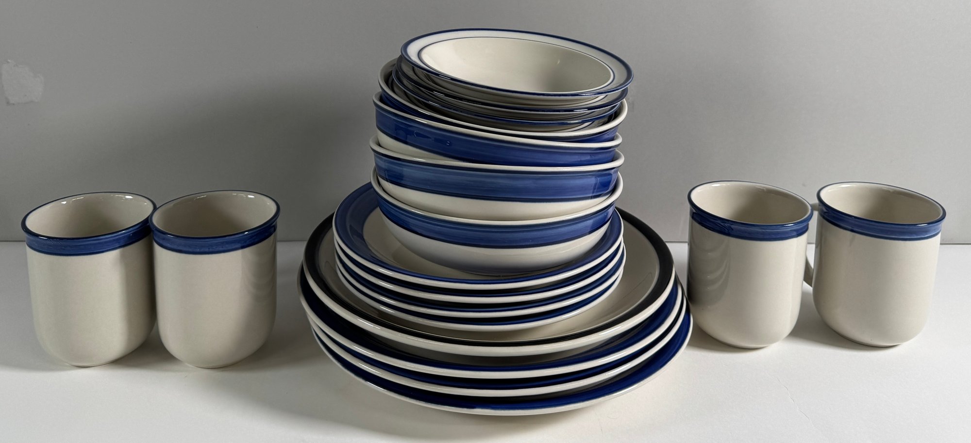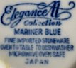 Elegance Collection 'Mariner Blue' stoneware set. Includes mugs (approx. 3" tall), plates (largest approx. 6"), and bowls. Oven-to-table, dishwasher and microwave safe. Made in Japan.