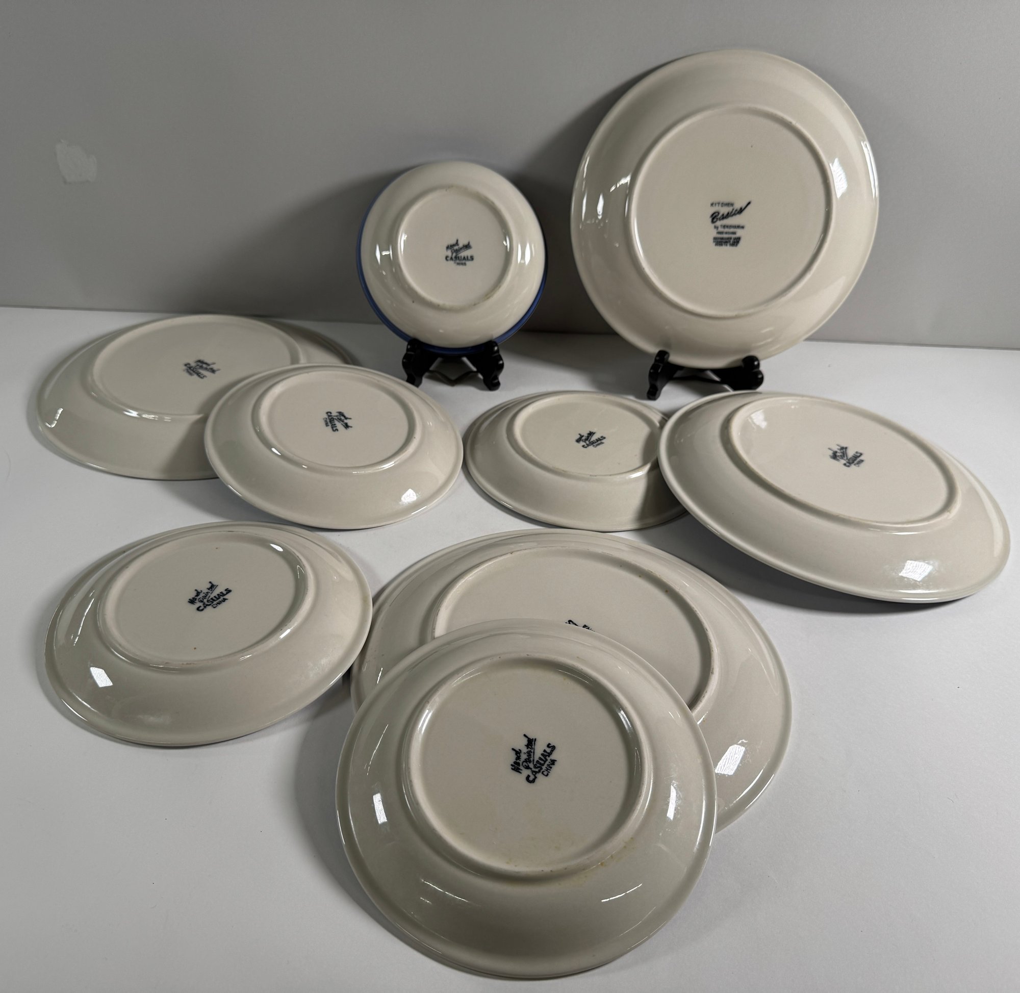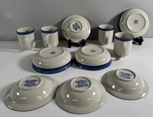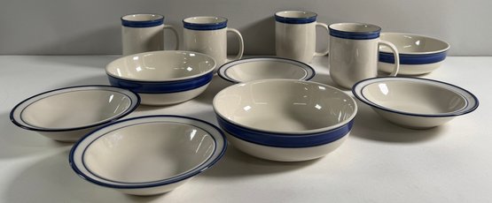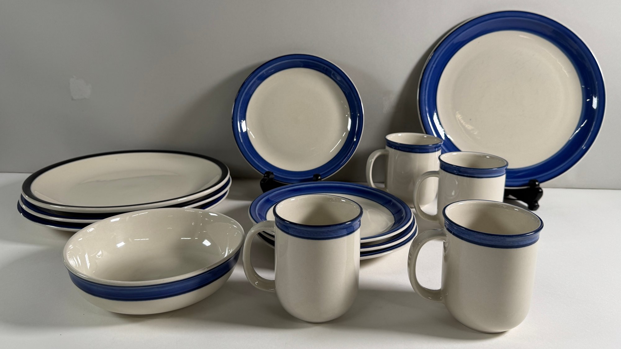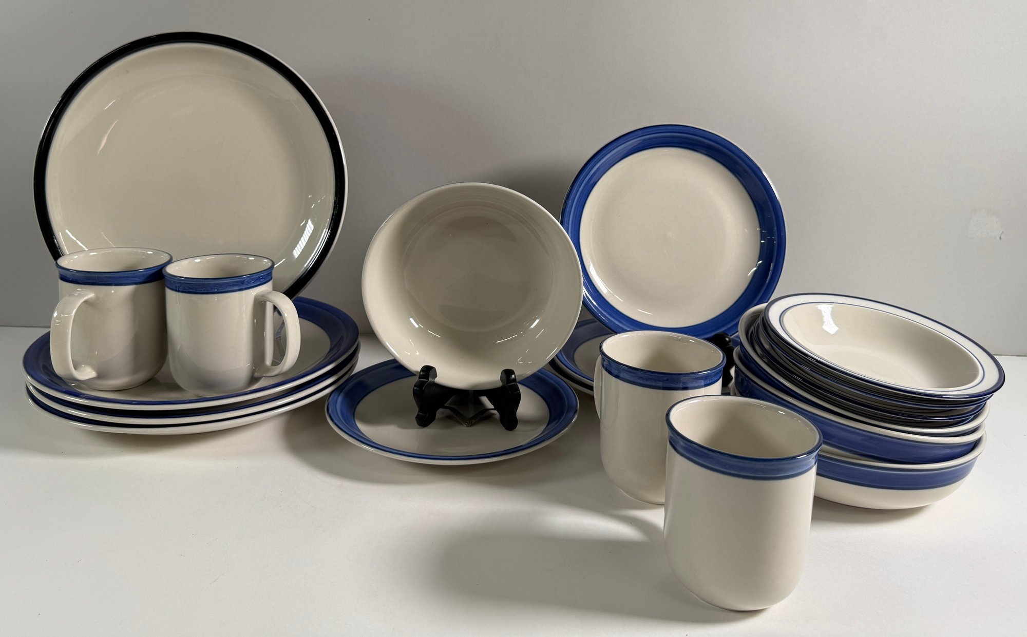Elegance Collection 'Mariner Blue' stoneware set. Includes mugs (approx. 3" tall), plates (largest approx. 6"), and bowls. Oven-to-table, dishwasher and microwave safe. Made in Japan.