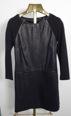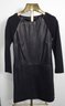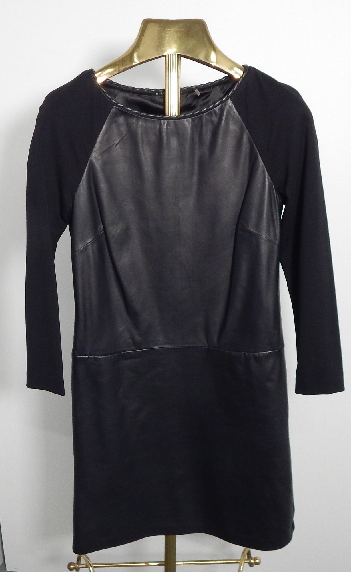 This black leather front dress has long sleeves and 2 small front pockets. Size 0. The back and sleeves are 63% rayon, 32% nylon, and 5% elastane. It is lined. Lining is 95% polyester and 5% elastane. Armpit to armpit is 16". Waist is also 16".