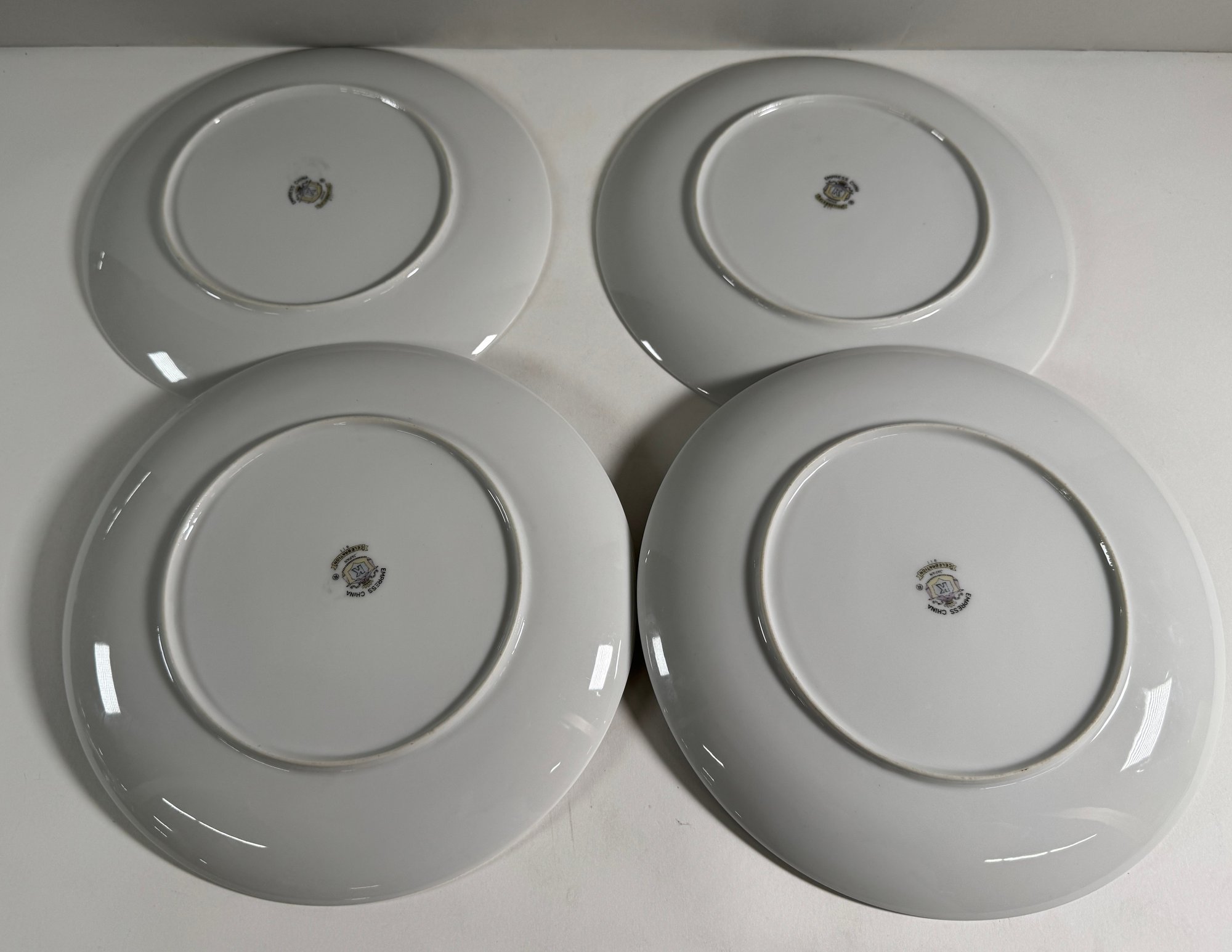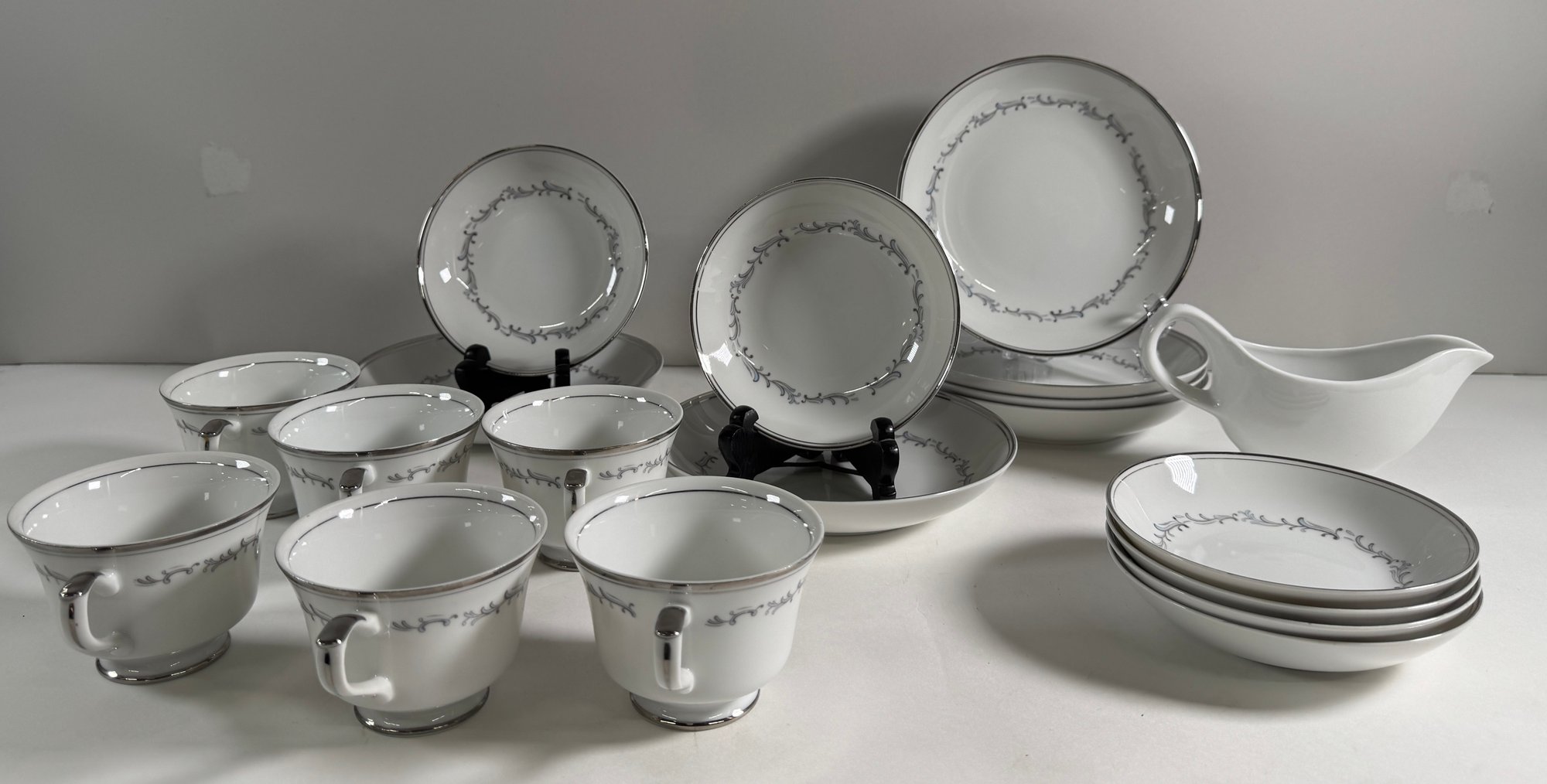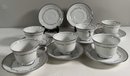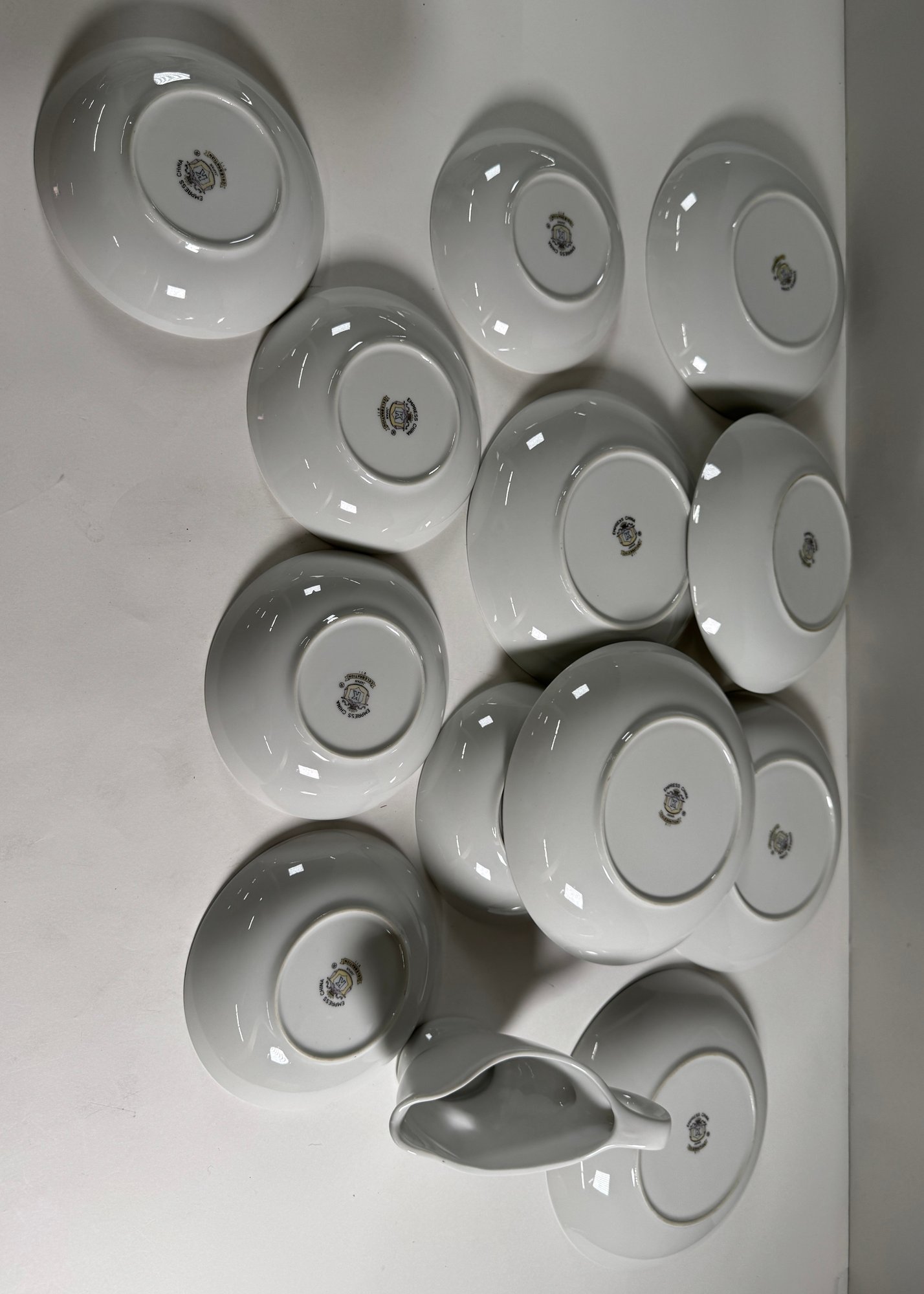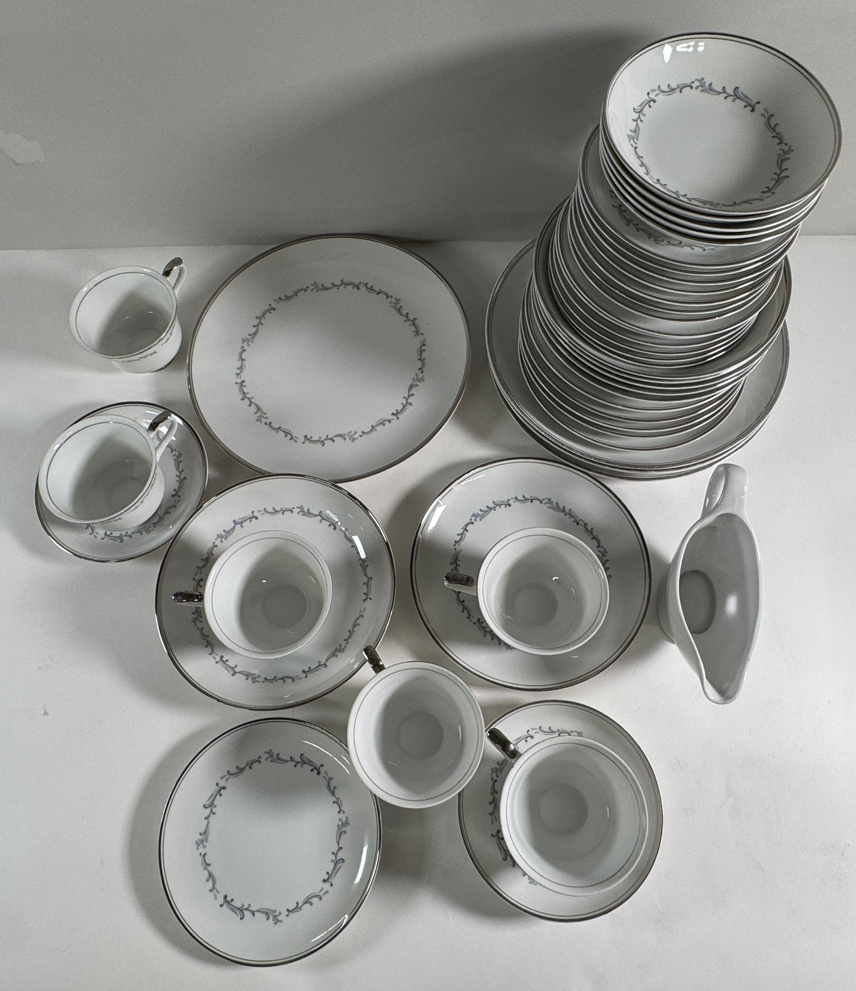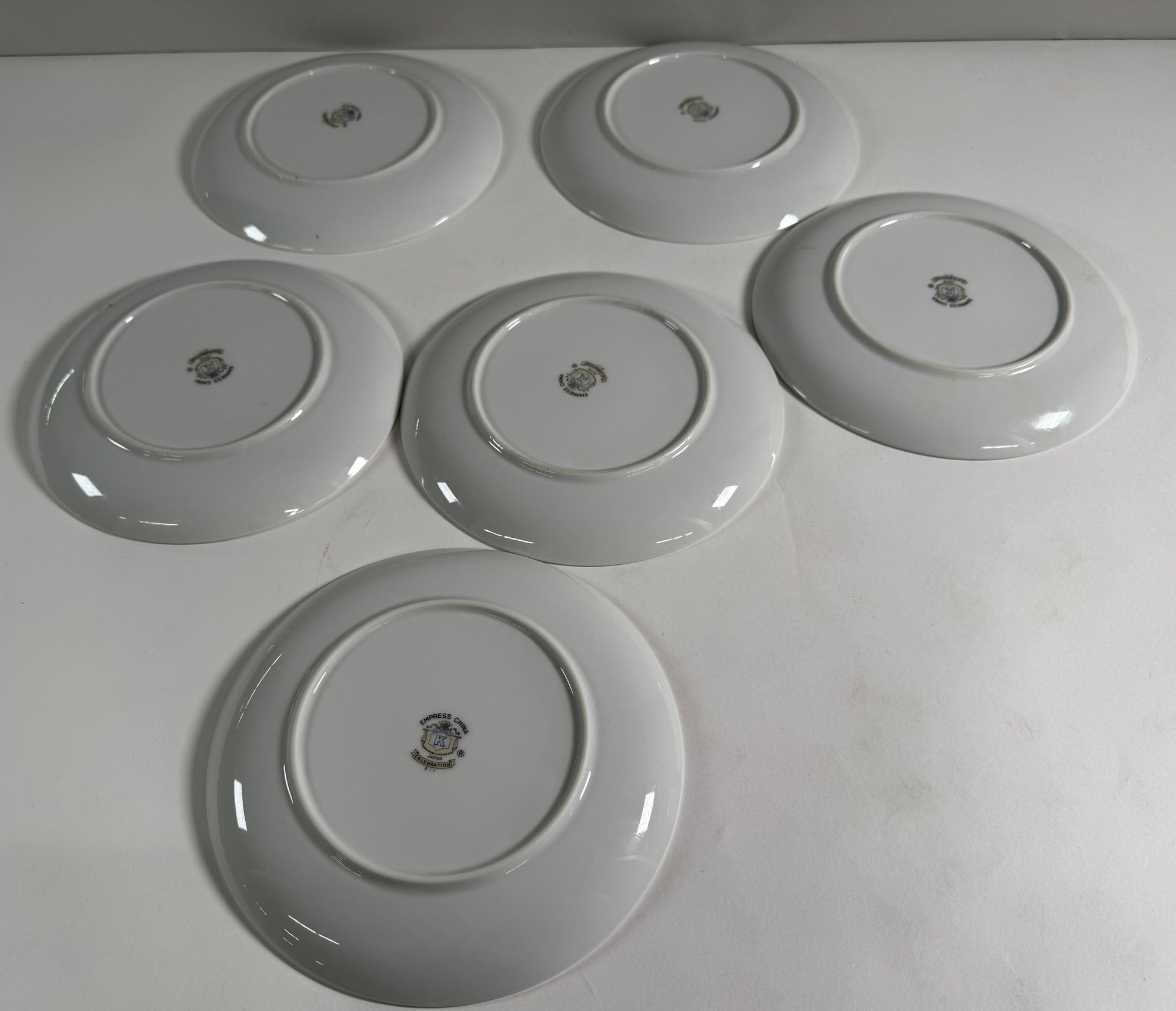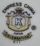 Empress China 'Celebration' pattern dinnerware set. Includes various plates, bowls, teacups, and a gravy boat. Largest plate measures 10.5 inches, tallest teacup is 2.25 inches.