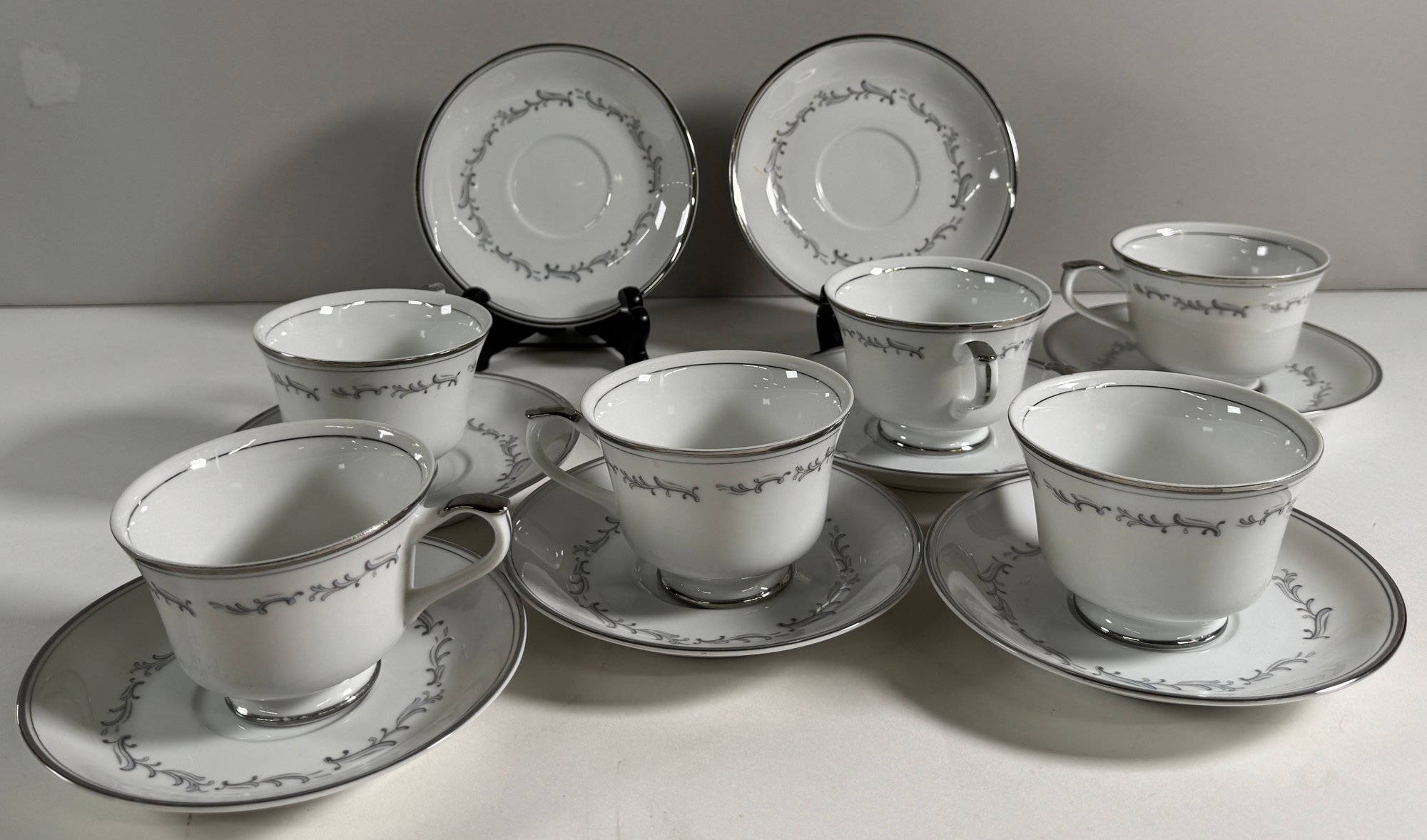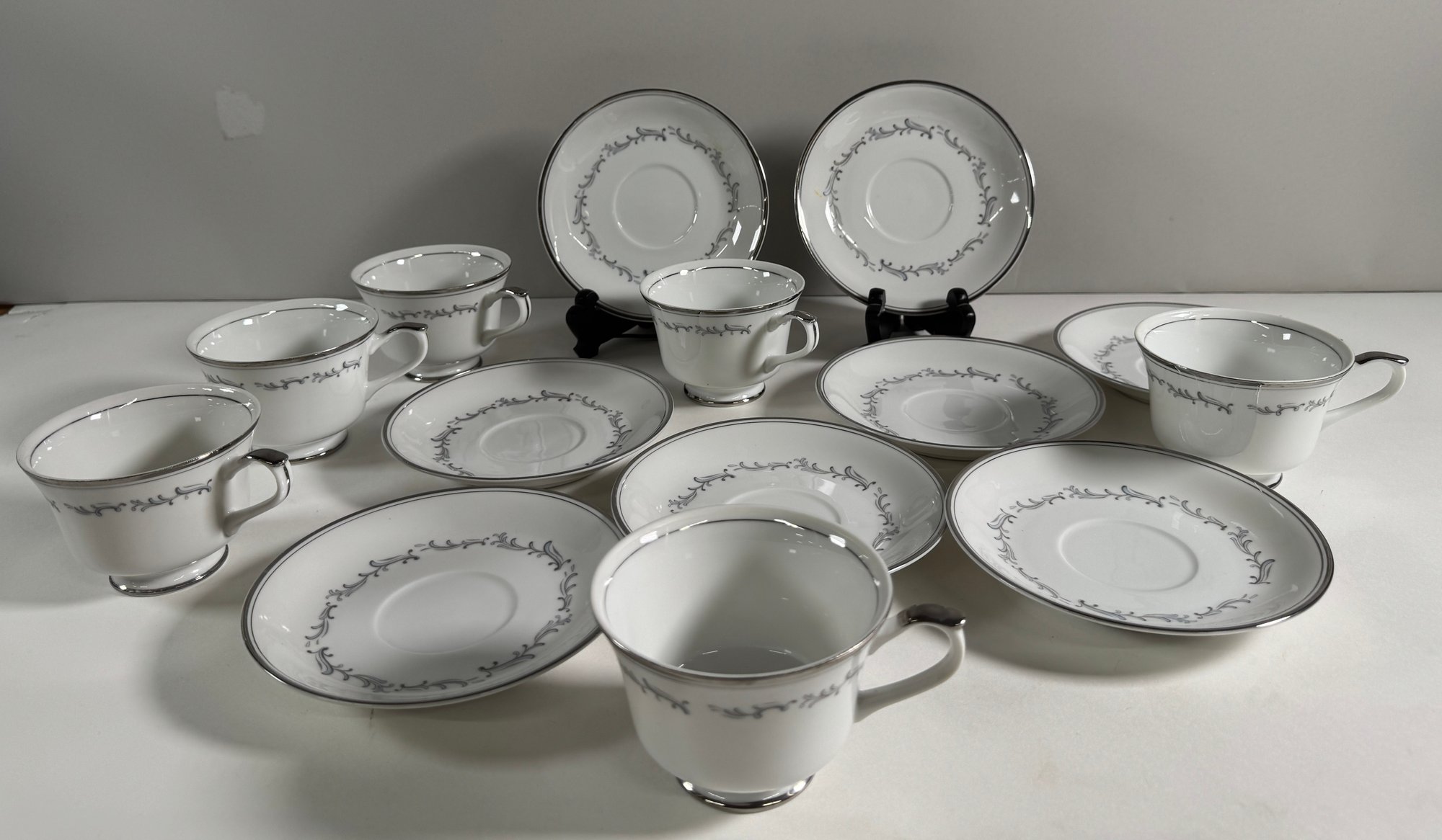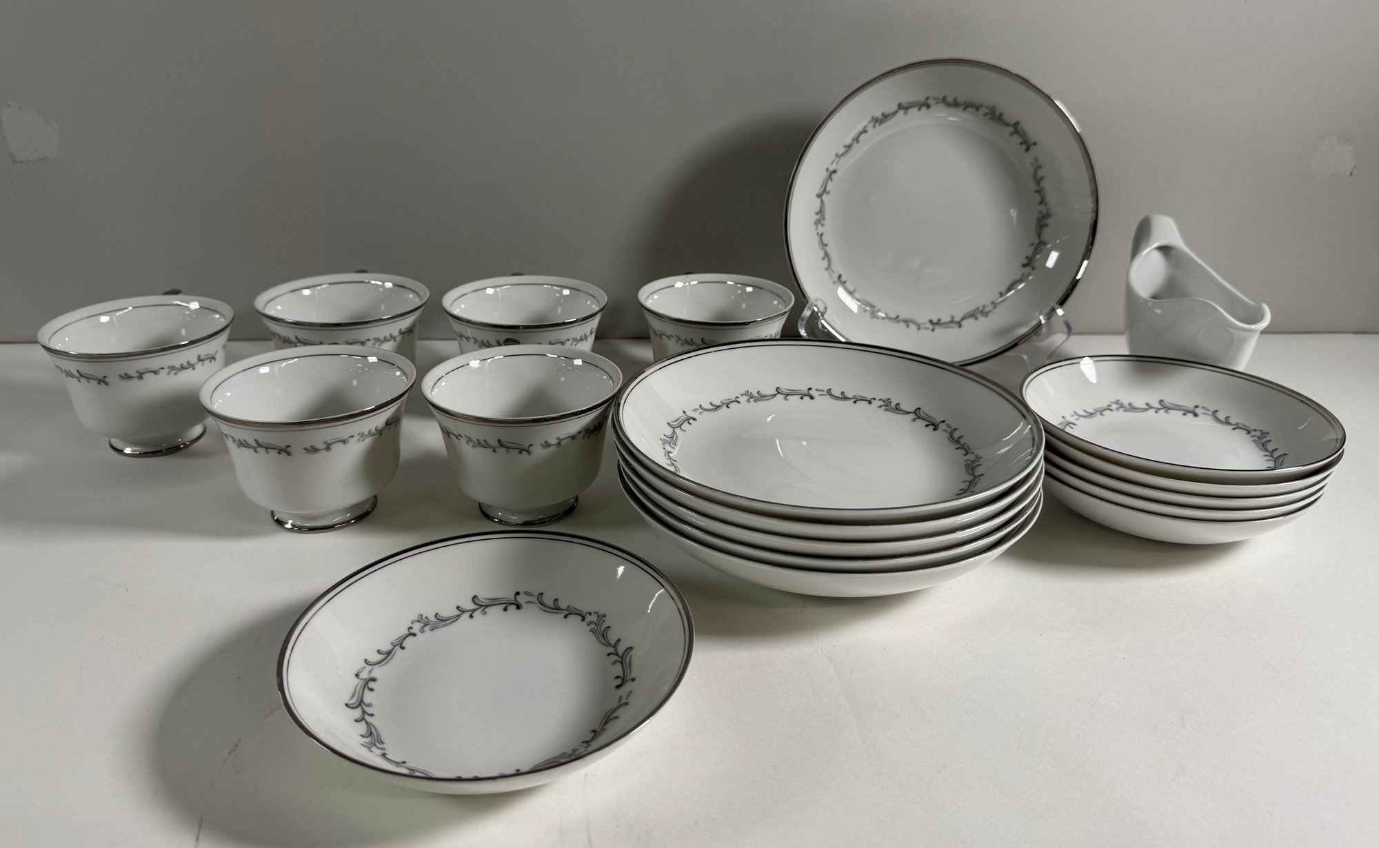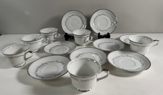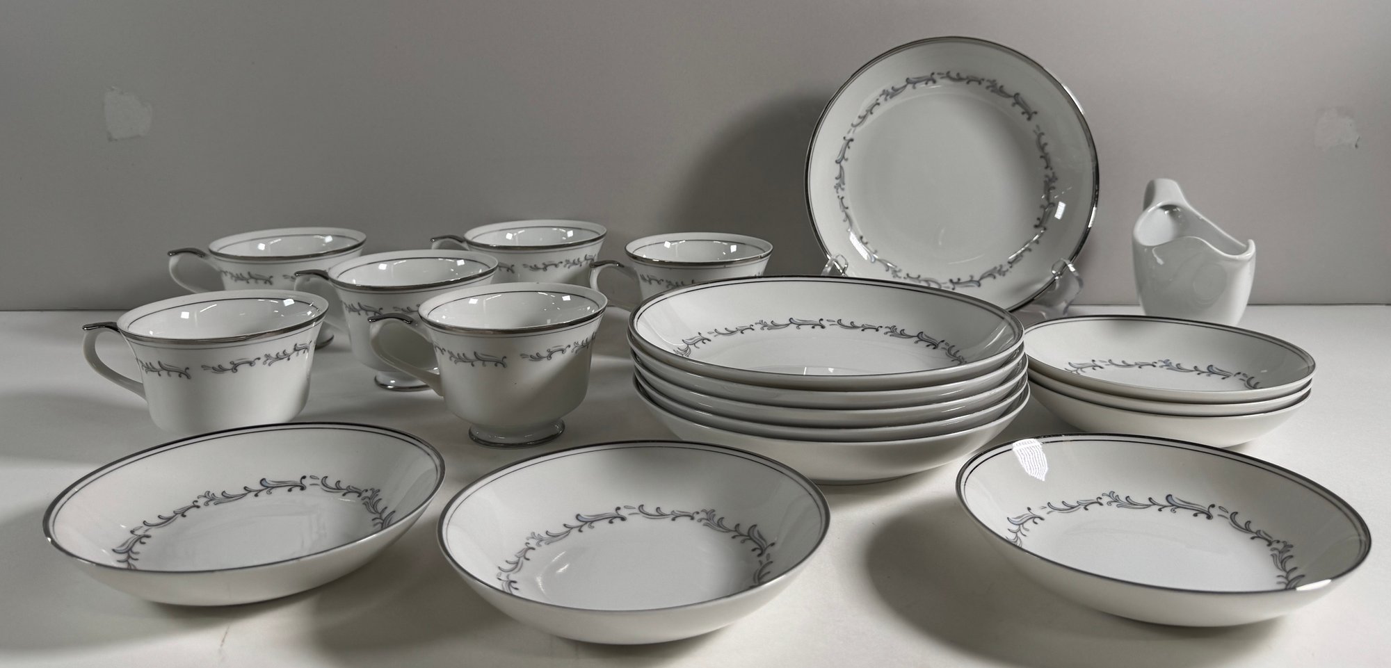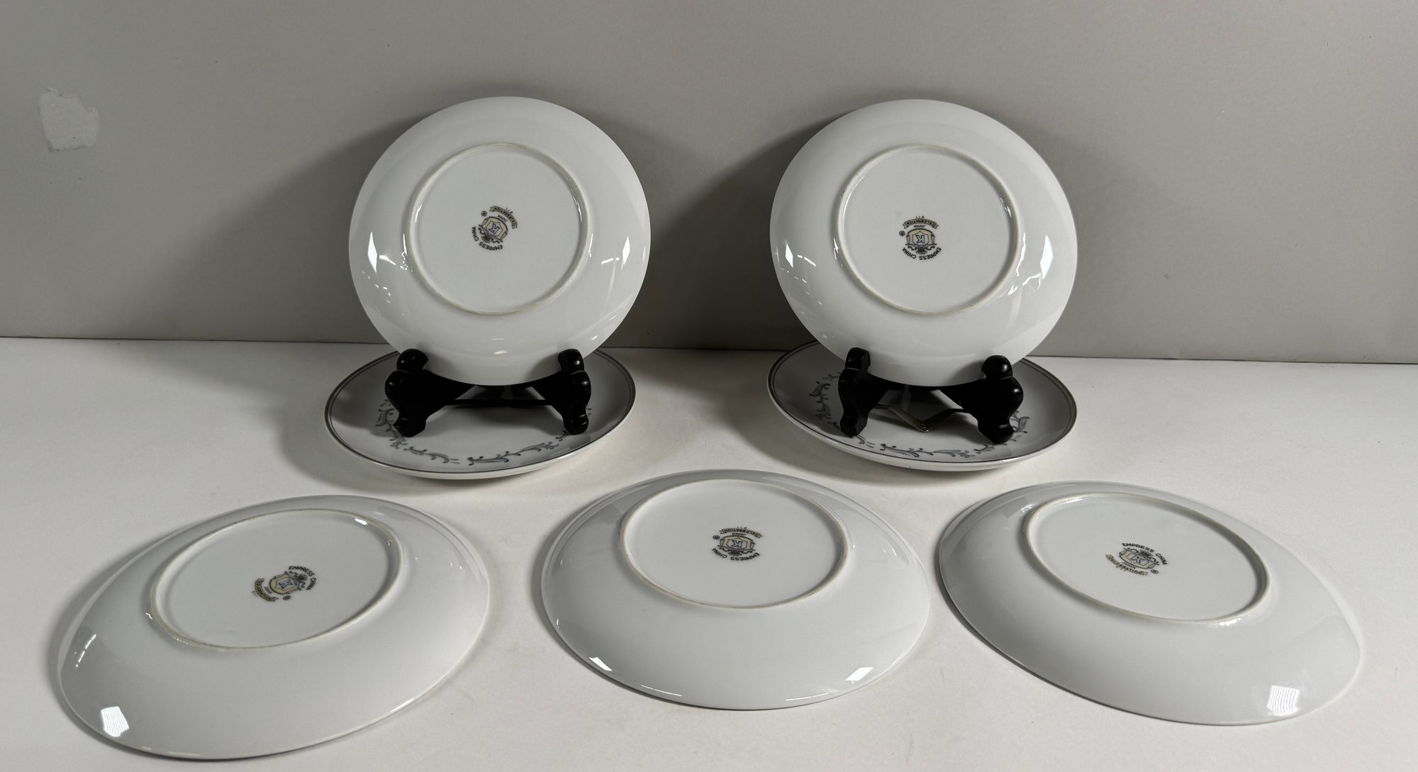 Empress China 'Celebration' pattern dinnerware set. Includes various plates, bowls, teacups, and a gravy boat. Largest plate measures 10.5 inches, tallest teacup is 2.25 inches.