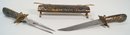 A nice vintage carving set in decorative hand enameled floral, footed wooden sheath with brass fittings. Knife and fork fit snugly into the sheath, all pieces have painted ion floral enamel. 14.25" long in total. Enamel does show wear in sections and there is loosening to the guard of the fork. Shipping available.