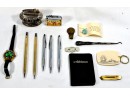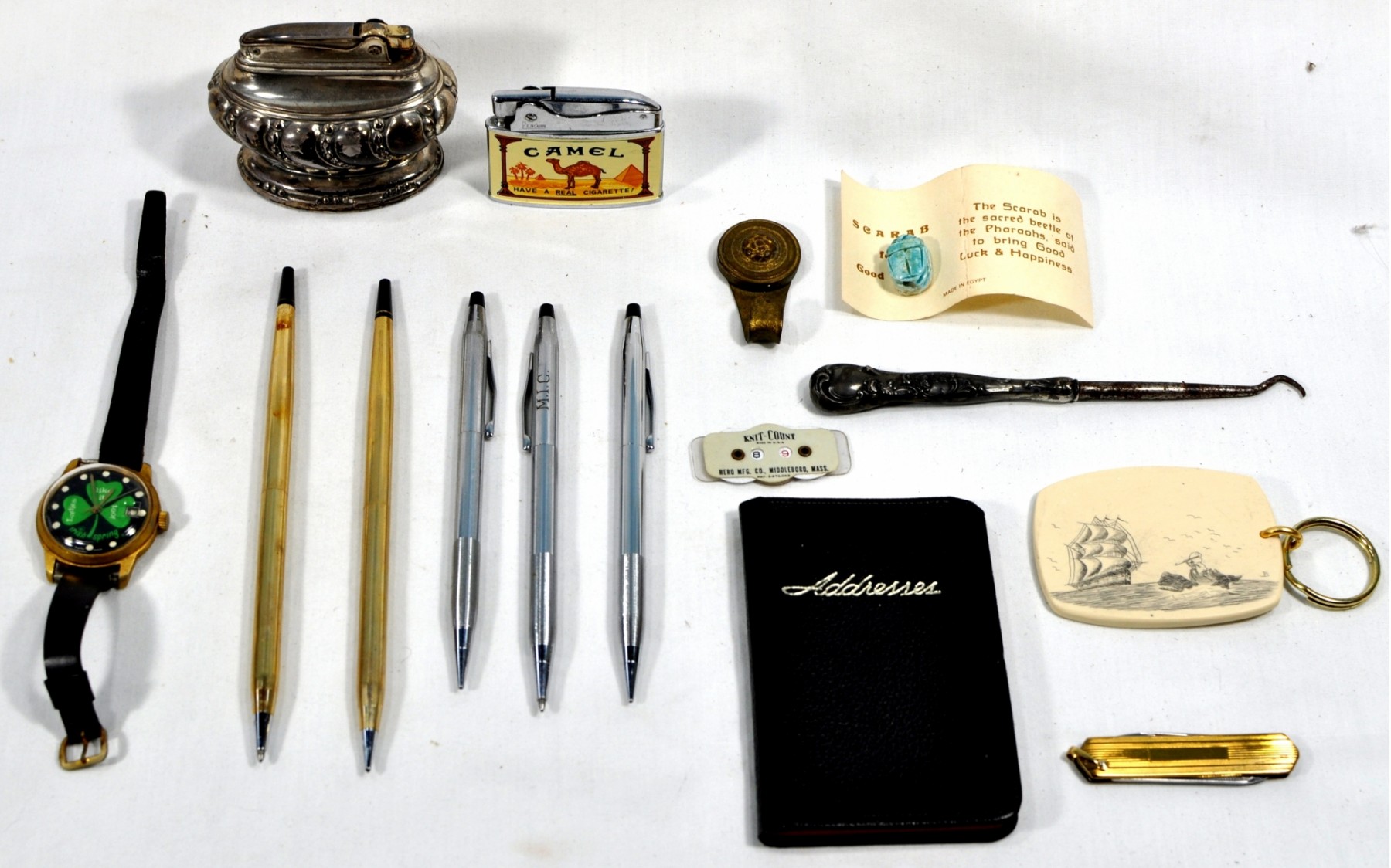 knitting hook with sterling silver handle, Cross pens and gold filled pencil and more.