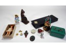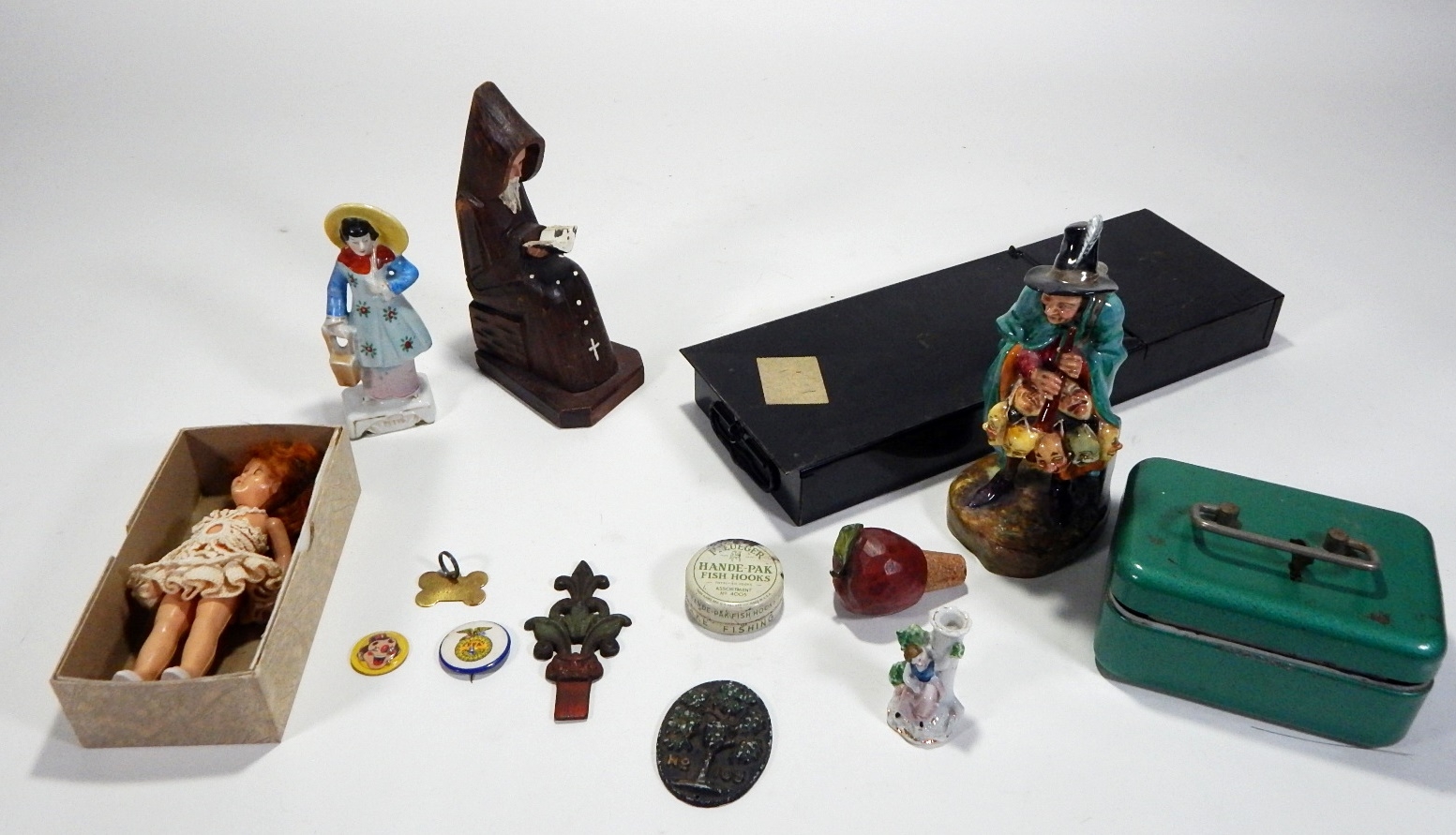Lot of miscellaneous things: metal boxes, marked doll in box, fishing hooks, dog tag, etc.
