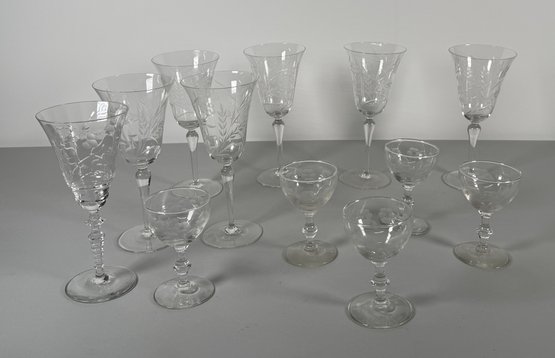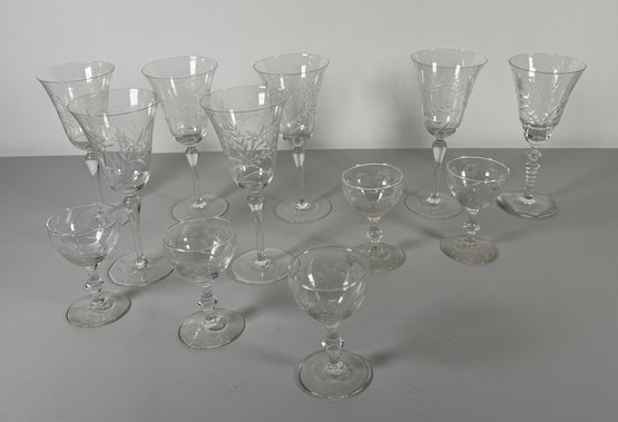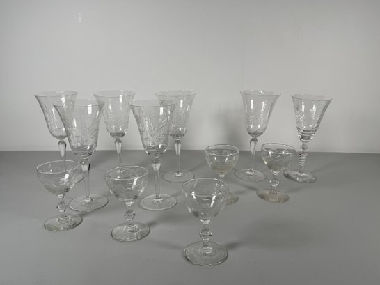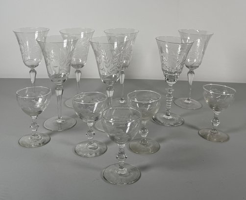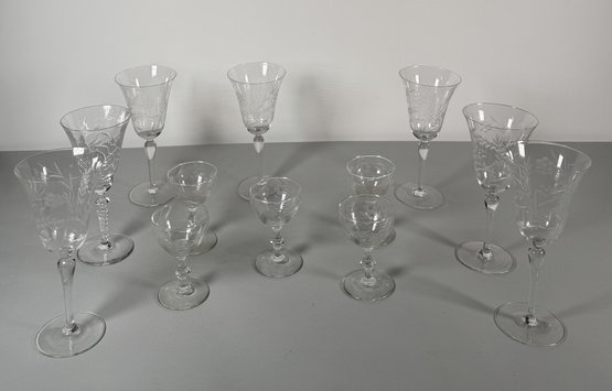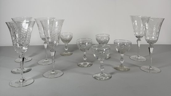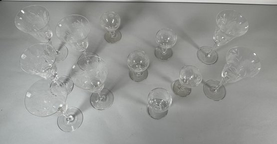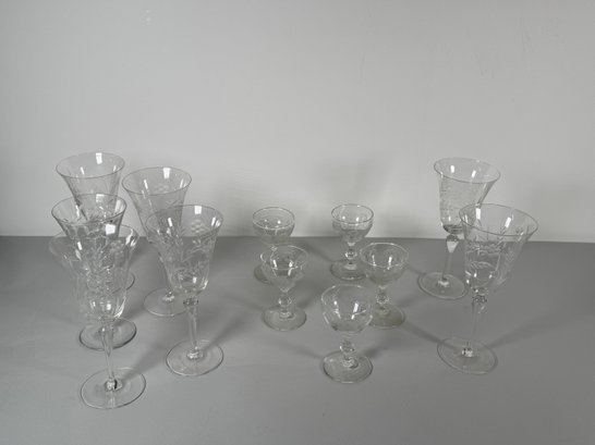Set of etched crystal glassware. Includes stemmed glasses and smaller cocktail glasses. Tallest glass is approximately 8 inches.