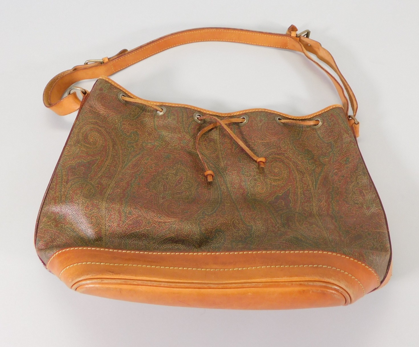 Paisley print bucket bag with an adjustable strap. Etro brand. The bottom has a little wear, as shown.