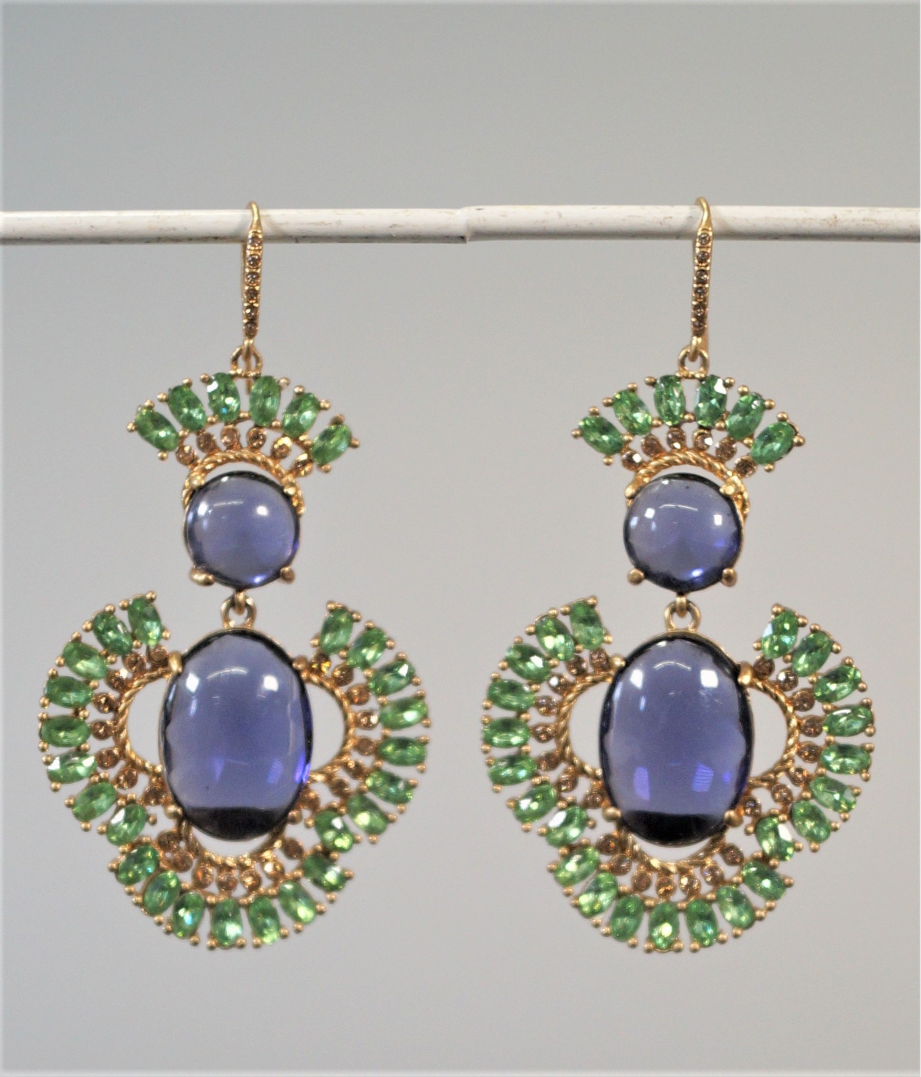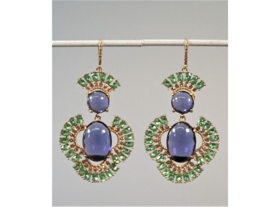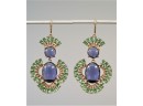 Listed is a pair of gorgeous statement earrings for pierced ears by fashion jeweler Carolee Lux. Two large lavender cabochons are surrounded by glittering green and gold cut stones. They measure 2.25" long x 1.5" wide. In very good condition with no signs of wear at all. Please see photos for details.